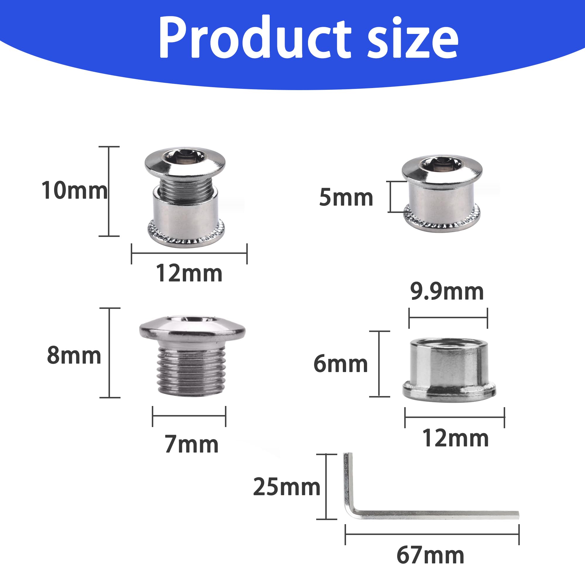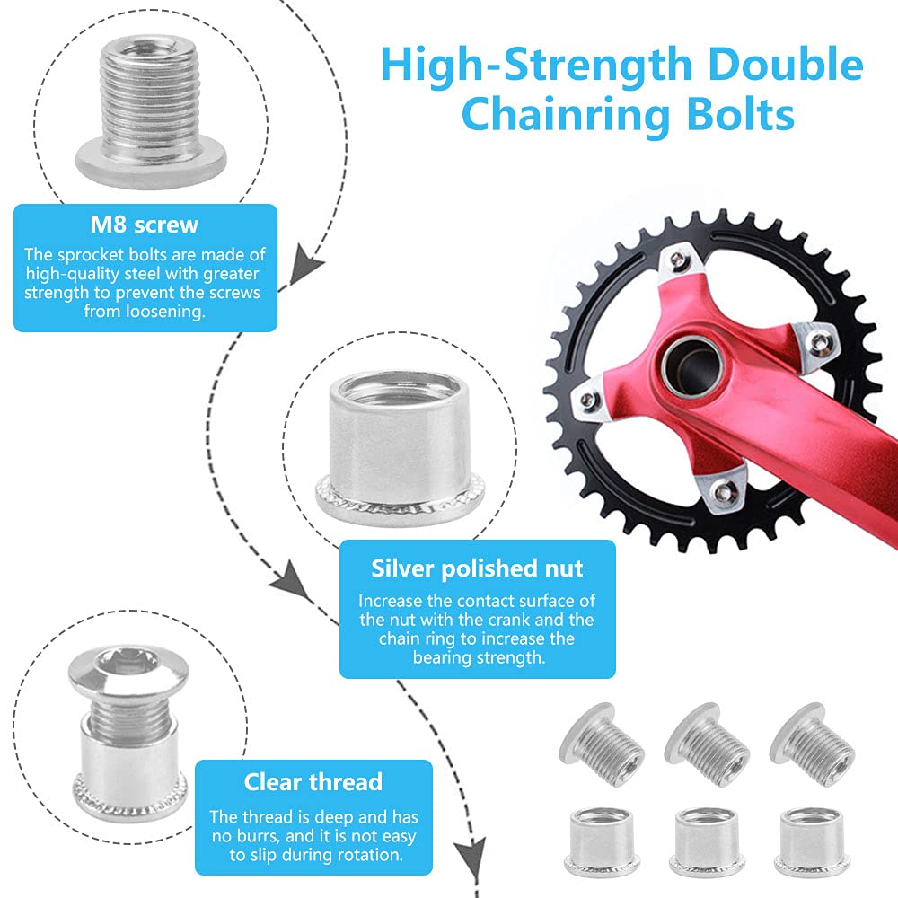 Das spezielle Design mit schmalen und breiten Zähnen sorgt für bessere Kraftübertragung und verhindert das Abrutschen der Kette. Die Schrauben sind rostfrei, farbecht und extrem langlebig. Sie dienen zur Befestigung von Kurbelgarnitur und Kettenblättern.