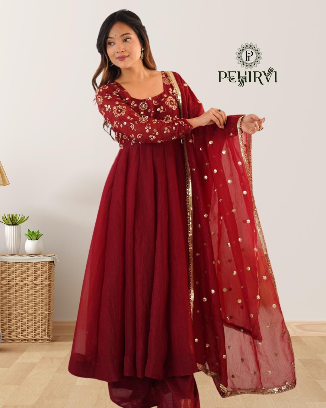 Mädels, dieses wunderschöne Anarkali Kurta Set von Aashita Creations lässt dich auf jeder Party strahlen! In leuchtendem Rot mit elegantem Golddruck bist du der absolute Hingucker.