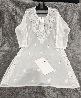 Wunderschöner Chickankari Kurti von DREAM & DZIRE - traditionelle Handarbeit meets moderner Style! Aus reiner Baumwolle gefertigt - super bequem und atmungsaktiv! In reinem Weiß mit eleganter Makai-Stickerei - sieht einfach edel aus! Wadenlänge und gerader Schnitt - schmeichelt jeder Figur! Mit Dreiviertelärmeln und Rundkragen - klassisch und zeitlos! Erhältlich in vielen Größen von S bis 8XL - für jede Frau die passende Größe! Brustumfang: S=34, M=36, L=38, XL=40, XXL=42, 3XL=44, 4XL=46, 5XL=48, 6XL=50, 7XL=52, 8XL=54 Zoll! Perfekt für formelle Anlässe, Büro oder festliche Events! Einfach zu pflegen - Handwäsche oder Schonwaschgang in der Maschine mit kaltem Wasser! Suchst du einen vielseitigen Kurti, der zu allem passt? Dieser ist ein absolutes Must-have! Kombinierbar mit Leggings, Churidar oder Jeans - deiner Kreativität sind keine Grenzen gesetzt!