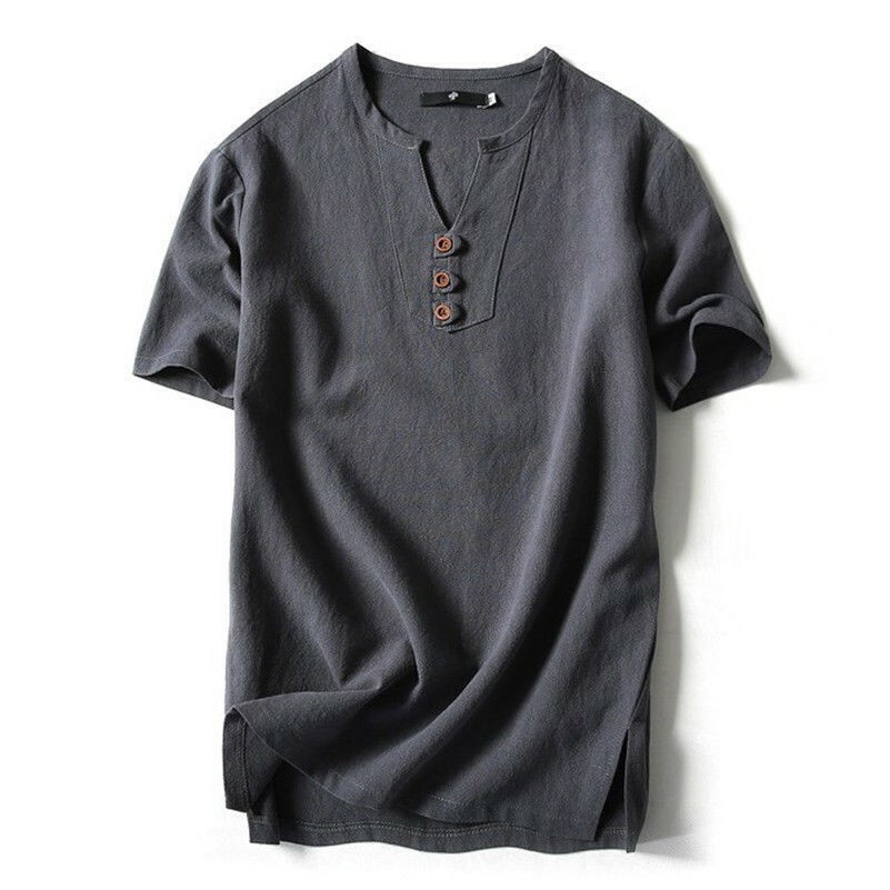 Herren Leinenhemd Kurzarm - Baumwoll-Leinen Mix Mit Henley-Kragen