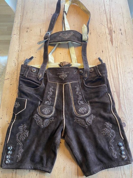 Echte bayerische Tradition! Diese kurze Lederhose 'Krokus' von Hirschberger ist aus super weichem Glattleder gefertigt und hat einen angesagten Vintage-Look. Durch spezielle Verarbeitung sieht jede Hose wie ein rustikales Erbstück aus - individuell gemustert und einzigartig. Traditionelle Stickereien an Hosenträger, Latz und Beinen, Knöpfe in Hirschhornoptik. Praktische Features: Weitenregulierung durch 'Brotzeitkante' am Bund, 2 Vordertaschen, Gesäßtasche, Messertasche am rechten Bein. Fällt etwas enger aus - am besten eine gut passende Hose zum Vergleich messen. Perfekt für Oktoberfest, Hochzeiten oder traditionelle Feste. Mit Hirschberger kaufst du Markenqualität und jahrzehntelange Handwerkskunst!