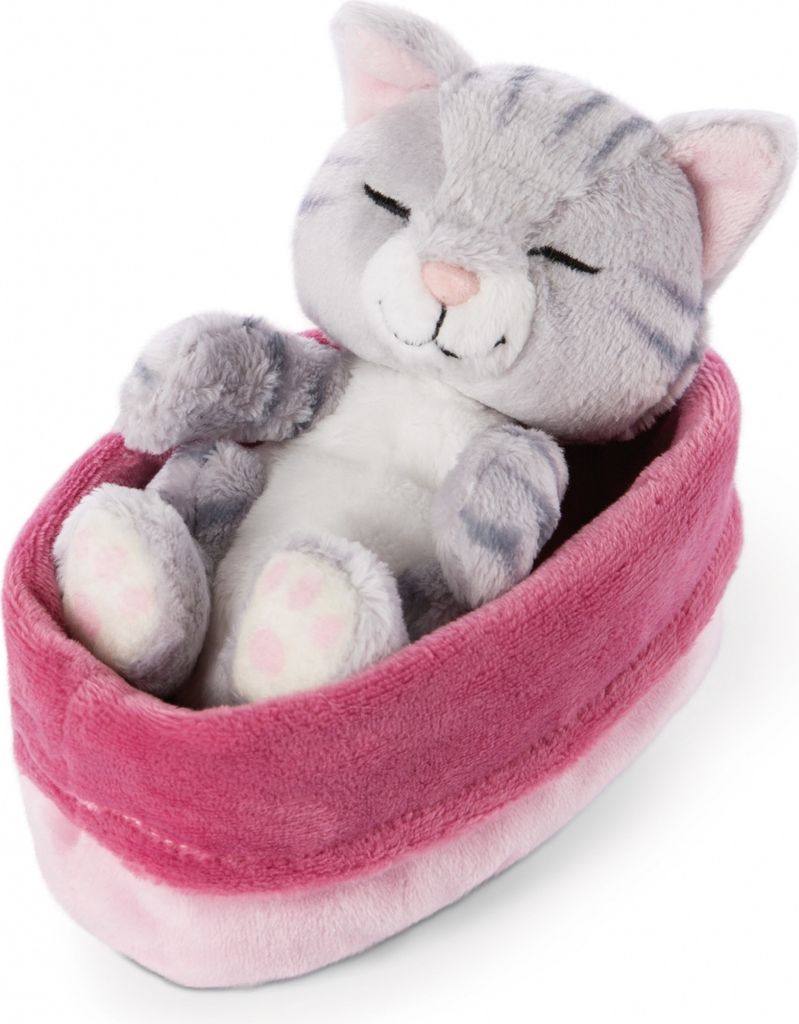 NICI Sleeping Kitties Kuscheltier 16cm - Graue Katze Im Pink-lila Körbchen Plüschtier