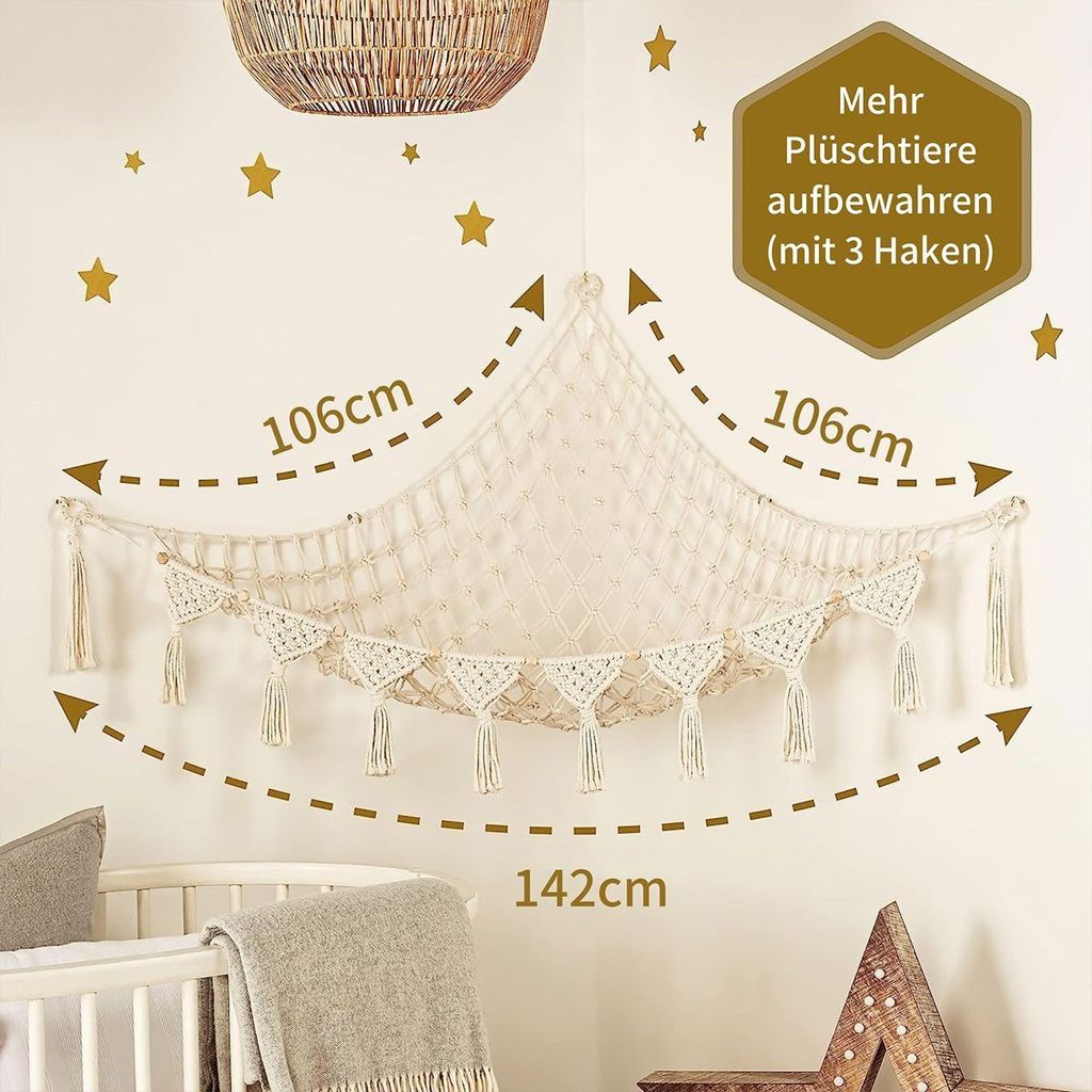 Schluss mit chaotischen Kinderzimmern! Diese süße Spielzeug-Hängematte ist die perfekte Lösung für all die Kuscheltiere, die sich bei dir tummeln. Aus robustem Baumwollseil gefertigt, bietet sie jede Menge Platz für Teddys, Puppen und anderes Spielzeug. Mit 3 Haken einfach in der Ecke des Zimmers aufhängen - die Installation dauert nur 10 Minuten! Das dreieckige Design ist super platzsparend und sieht dazu noch richtig niedlich aus mit den dekorativen Quasten. Im böhmischen Stil passt sie perfekt ins Kinderzimmer, Spielzimmer oder sogar auf den Balkon. Nicht nur praktisch, sondern auch ein echter Hingucker! Die starke Tragfähigkeit hält auch viele Kuscheltiere aus. Ein tolles Geschenk für Kindergeburtstage, Weihnachten oder einfach so. Dein Kind wird liebend gerne seine Spielsachen da reinräumen - versprochen!