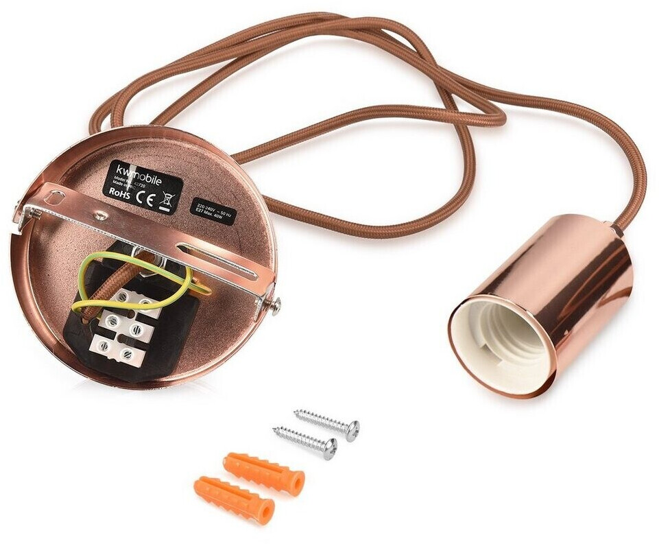 Diese E27 Lampenfassung von kwmobile ist perfekt für den angesagten Retro-Look! Mit 90cm langem Textilkabel in weiß - sieht super stylisch aus. Ideal für Edison-Birnen und andere dekorative Leuchtmittel. Maximal 60 Watt Belastung - ausreichend für die meisten Beleuchtungsideen. Aus Eisen, PVC, Textilfaser und Kupfer gefertigt - gute Qualität. Einfach an der Decke zu befestigen - Montagematerial ist dabei. Die 2-adrige Lüsterklemme ist verschiebbar - praktisch beim Anschluss. Passt in jedes Zimmer - Wohnzimmer, Esszimmer, Arbeitszimmer oder Schlafzimmer. Kabel kann individuell gekürzt werden - einfach Kabelverschraubung lösen. Made in Germany - Qualität die man kennt. Einfach Leuchtmittel reinschrauben, aufhängen und genießen! Für alle, die individuelle Beleuchtungslösungen lieben - ein echter Hingucker!