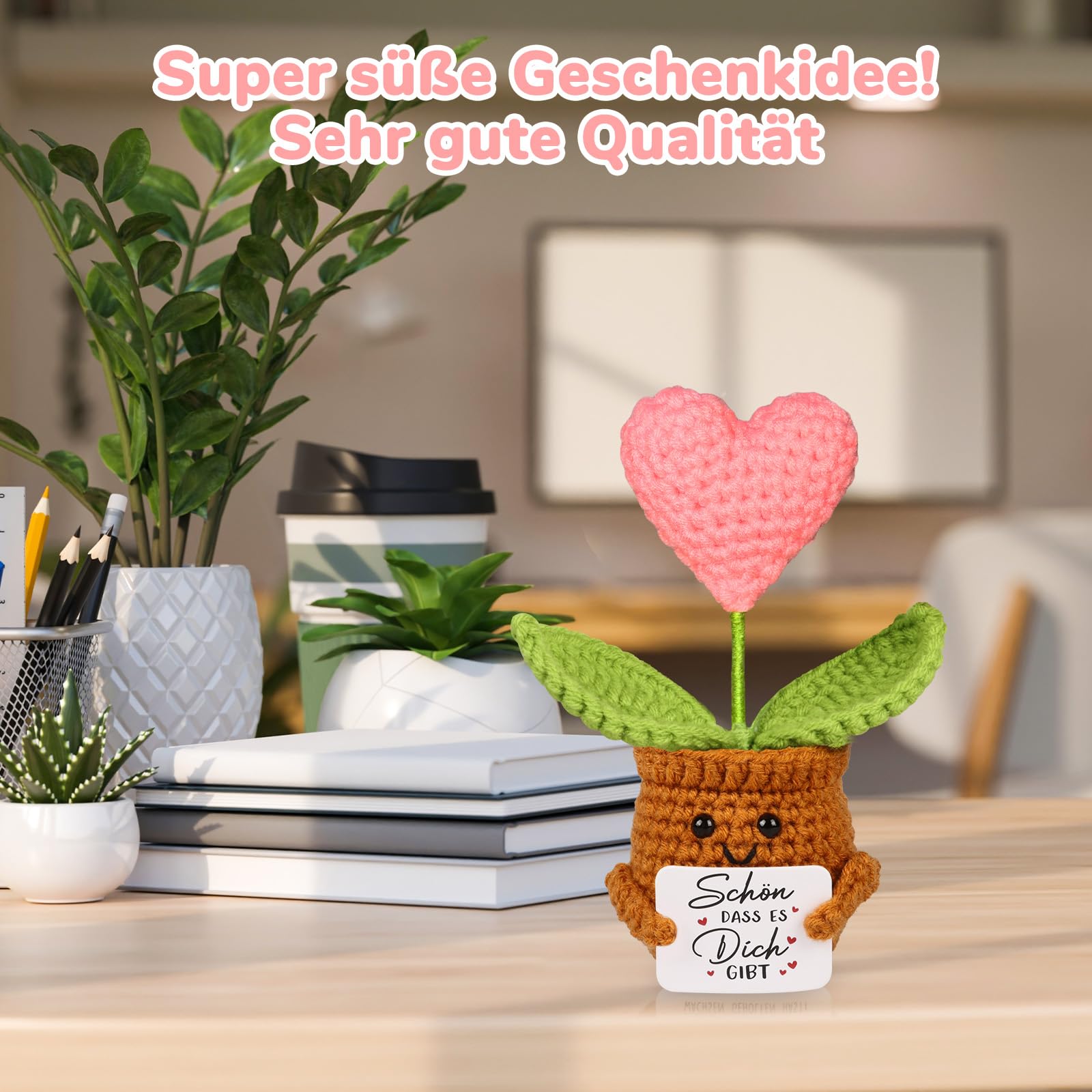 Diese süße gestrickte Blumen-Puppe ist einfach der reinste Sonnenschein! Jede Blume wird liebevoll von Hand gehäkelt - das spürt man einfach. Aus weichem, hochwertigem Garn gemacht, mit so viel Liebe zum Detail, dass man einfach schmunzeln muss. Das Besondere: Jede Puppe ist ein Unikat, genau wie die Person, die sie bekommt! Mit dabei ist eine berührende Dankeskarte (\Danke, dass du mir beim Wachsen geholfen hast\) - perfekt also für Lehrer, Erzieher oder einfach Menschen, die eine kleine Aufmunterung gebrauchen können. Ob auf dem Schreibtisch, im Regal oder als Tischdekoration bei Feiern - diese fröhliche Blume verbreitet sofort gute Laune. Ein Geschenk, das von Herzen kommt und wirklich ankommt. Egal ob zum Geburtstag, zu Weihnachten, zum Muttertag oder einfach mal so zwischendurch - diese kleine Puppe umarmt deine Liebsten ohne Worte. Sie erinnert daran, dass jemand an sie denkt und ist ein toller kleiner Begleiter für jeden Tag.