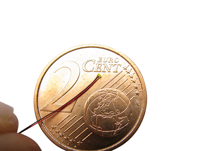 Alter! Diese SMD LED 0201 ist ja winzig klein - die kleinste Serien-LED der Welt! Mit nur 0,65 x 0,35 x 0,20 mm ist sie perfekt für Modelleisenbahnen, Dioramen oder jeden anderen feinen Modellbau. Die LED kommt schon fertig verlötet mit superdünnem 0,15mm Kupferlackdraht (150mm lang). Plus-Pol ist rot, Minus-Pol schwarz markiert - total praktisch! Leuchtet in einem schönen echten Grün mit ca. 80mcd Helligkeit. Wichtig: Für den Betrieb brauchst du je nach Anwendung Vorwiderstände oder Spannungswandler. Bei 1,2V Akkuspannung (PKW-Modelle) brauchst du für alle Farben Spannungswandler, bei 2,4V (LKWs) gehen rote, gelbe, orange und grüne LEDs direkt mit 100 Ohm Vorwiderstand. Einfach ein cooles Teil für alle, die ihre Modelle perfekt beleuchten wollen! Aber Achtung: Nicht für Kinder unter 14 Jahren geeignet.