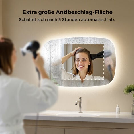 Dieser LED-Spiegel verwandelt dein Badezimmer in eine Wellness-Oase! Mit 70x45cm Größe bietet er genug Platz für die morgendliche Routine. Die drei Lichtfarben (Warmweiß/Neutralweiß/Kaltweiß) sind stufenlos dimmbar - so findest du immer die perfekte Beleuchtung. Die große Anti-Beschlag-Fläche (25x30cm) sorgt auch nach dem Duschen für klare Sicht. Super praktisch: Die Memory-Funktion merkt sich deine letzte Einstellung. Der rahmenlose Design sieht mega modern aus und die IP65-zertifizierte LED-Leiste ist absolut wasserdicht. Einfache Montage - horizontal oder vertikal. Mit 50.000 Stunden Lebensdauer hast du lange Freude an diesem High-Tech-Spiegel!