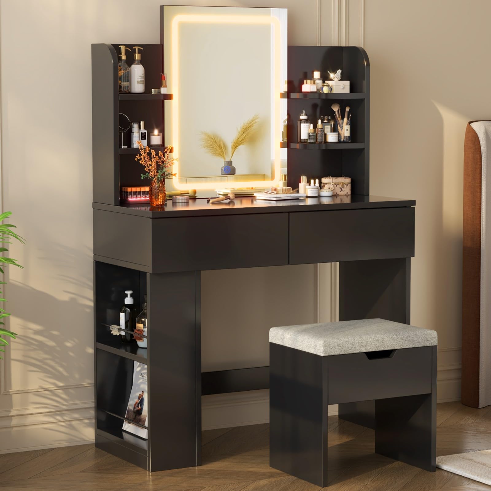 Dein persönliches Beauty-Studio! Dieser 120cm breite Schminktisch mit LED-Beleuchtung hat alles: 3 Schubladen, 2 Türen, 6 Fächer und einen Schiebespiegel. Die 10 LED-Lampen mit 3 Farbtemperaturen sorgen für perfektes Make-up-Licht. Inklusive praktischem Hocker. Einfache Montage und super Stauraum für alle Beauty-Produkte. Schwarz/Weiß Design passt in jedes Schlafzimmer!