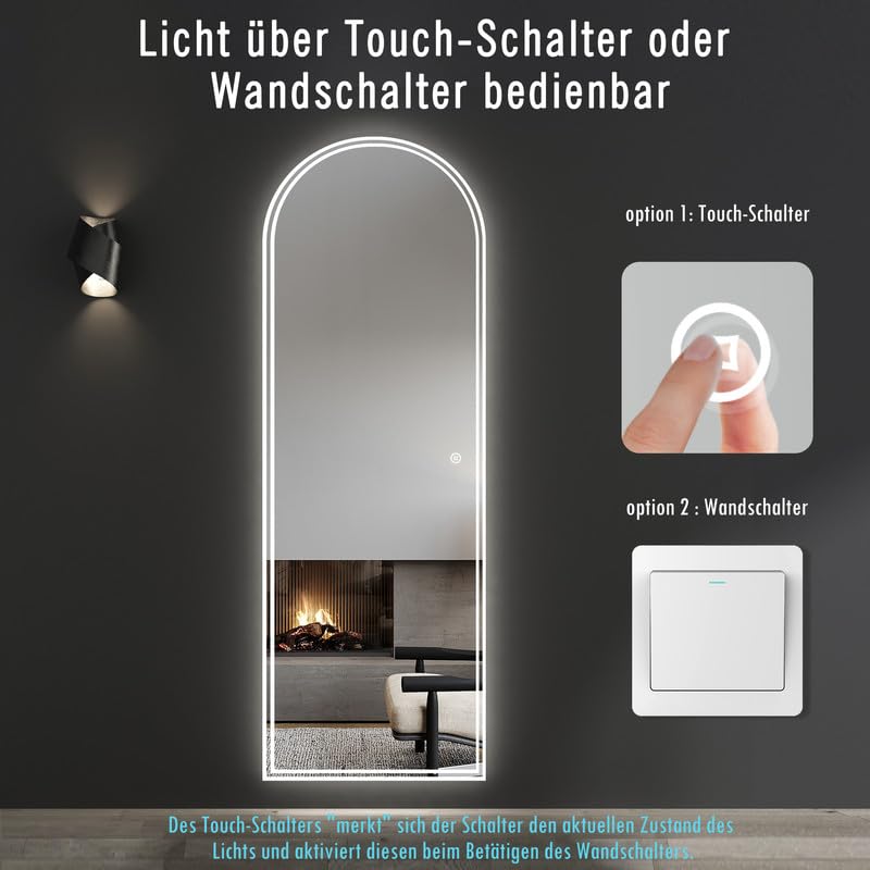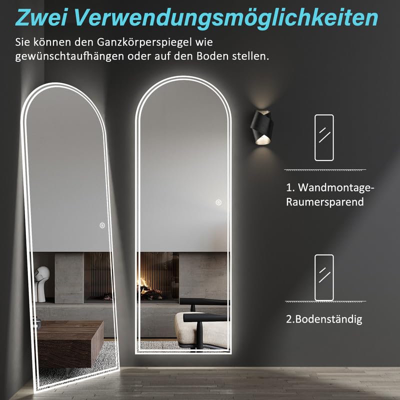 Endlich der perfekte Spiegel für dein Outfit-Check! Dieser LED-Ganzkörperspiegel zeigt dir alles in perfektem Licht - von Kopf bis Fuß.\n\nMit dimmbarer Beleuchtung von 3000K (warmweiß) bis 6500K (tageslichtweiß). So findest du für jede Tageszeit und Stimmung das richtige Licht.\n\nTechnische Highlights:\n• Maße: 60x165cm - siehst dein komplettes Outfit\n• Gewicht: 17kg - stabil und standfest\n• 5mm HD Spiegel - verzerrungsfrei\n• Memory-Funktion - merkt sich deine Lieblingseinstellung\n• Touch-Schalter - moderne Bedienung\n\nEinfach aufhängen - die Haken sind schon vorinstalliert. Perfekt für:\n• Schlafzimmer und Ankleidezimmer\n• Flur und Wohnzimmer\n• Badezimmer (wenn Platz ist)\n\nDas Licht ist hell genug für Make-up und Styling, aber angenehm für die Augen. Kein geblende mehr!\n\nDer gebogene Rahmen sieht mega edel aus und gibt jedem Raum das gewisse Etwas. Einfach anschalten und sich wohlfühlen!\n\nHol dir diesen Traumspiegel - deine Outfits werden nie wieder im falschen Licht dastehen!