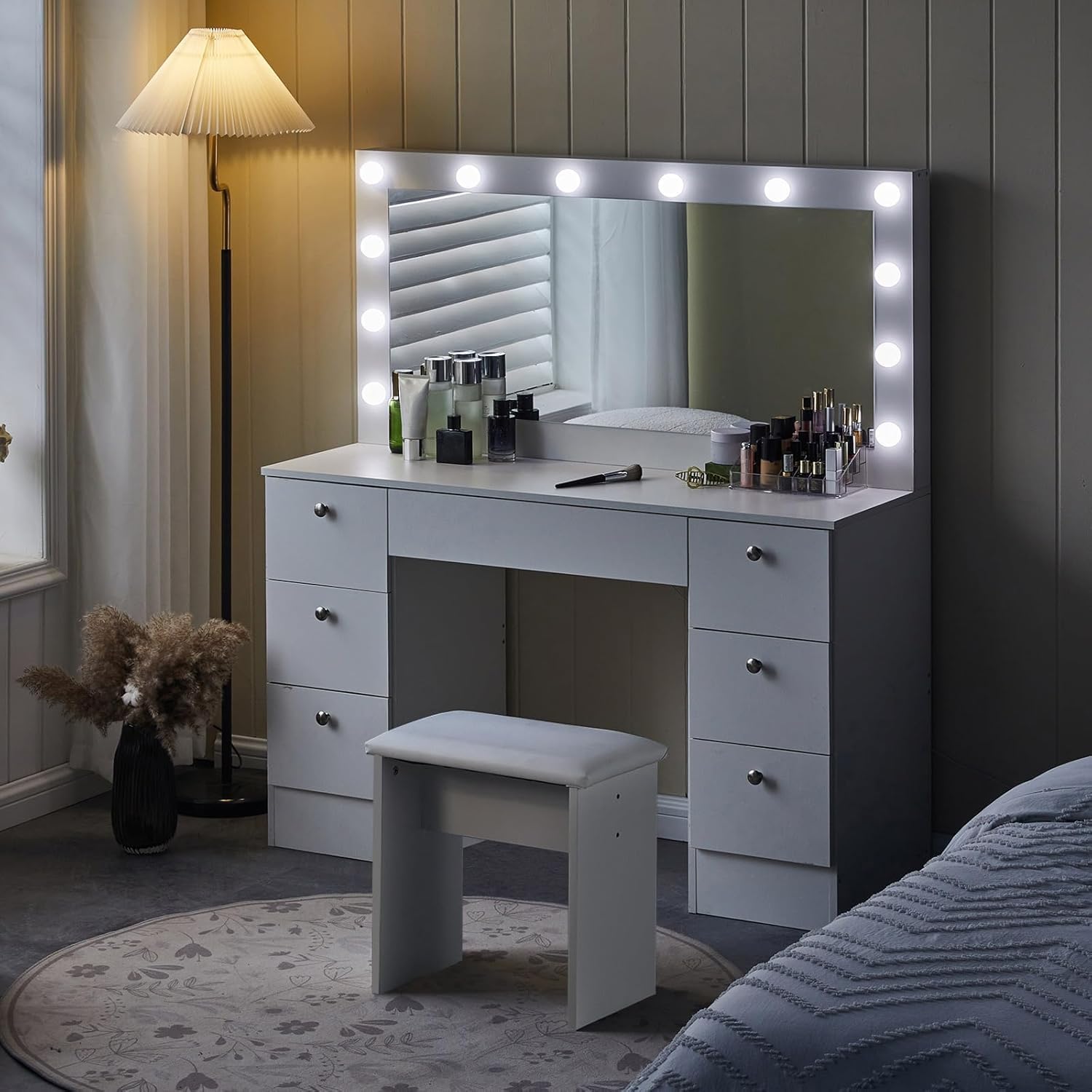 BEWISHOME Schminktisch Mit LED Beleuchtung - Großer Kosmetiktisch Mit 9 Schubladen & Hocker