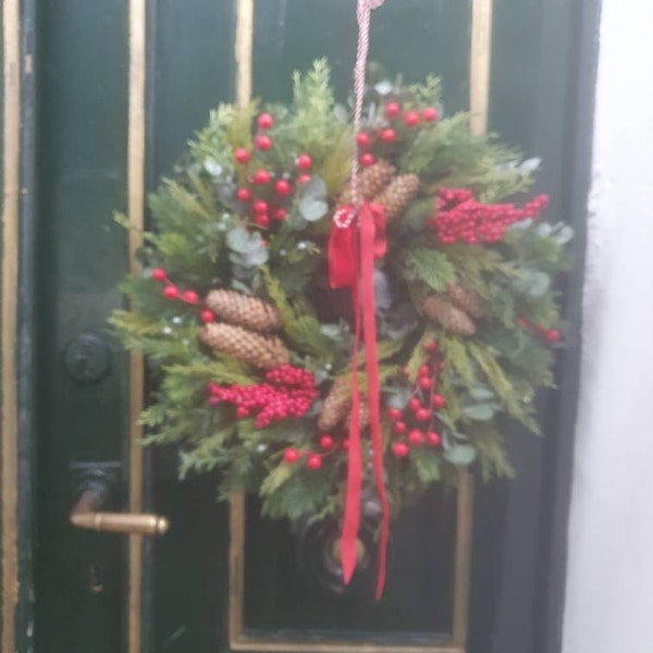 Weihnachtskranz Mit LED Beleuchtung - Türkranz Mit Tannenzapfen & Roten Beeren 30x40cm