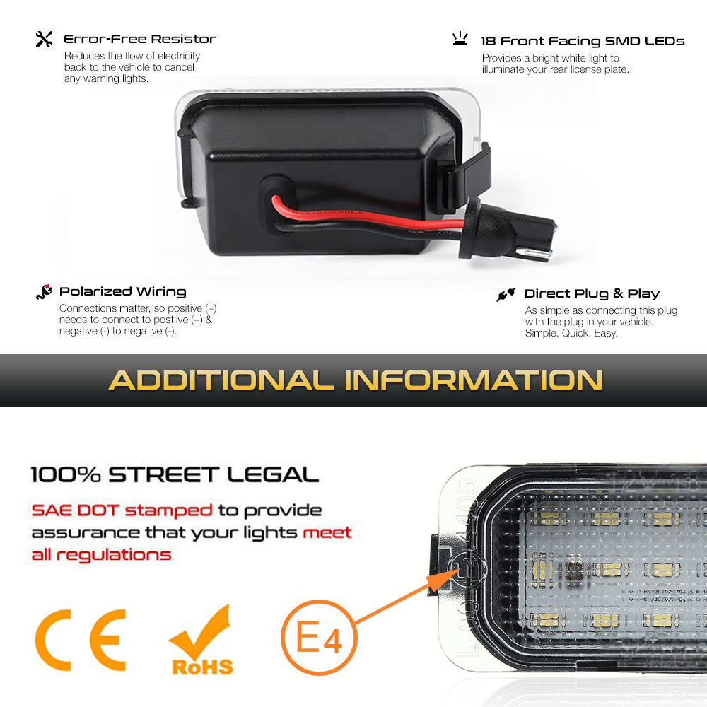 Die Verarbeitung ist hochwertig und die Leuchten sind wasserdicht - da macht auch schlechtes Wetter nichts aus. Ob Regen, Schnee oder carwash - deine Kennzeichenbeleuchtung bleibt zuverlässig in Funktion.