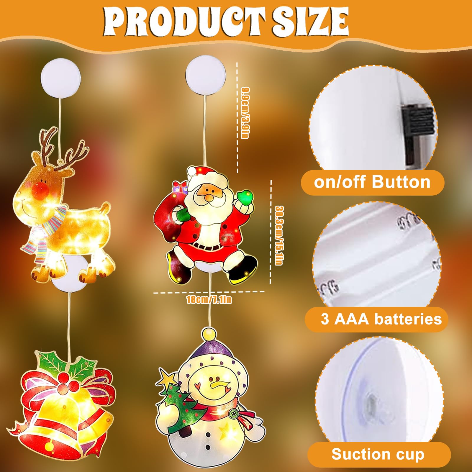 Coole Weihnachtslichter fürs Fenster! 4 Stück mit Saugnapf - einfach an jede glatte Oberfläche drücken. Doppelseitig bedruckt, sehen also von innen und außen gut aus. Mit Timer-Funktion, spart Batterien. Benötigt 3x AA-Batterien (nicht dabei). Aus PVC, wetterfest - geht also auch draußen. Vollständig gekapselt, super sicher. Einfach einschalten und schon wird's weihnachtlich! Perfekt für Fenster, Türen, Weihnachtsbäume... überall wo's festlich sein soll. Macht sofort Stimmung!