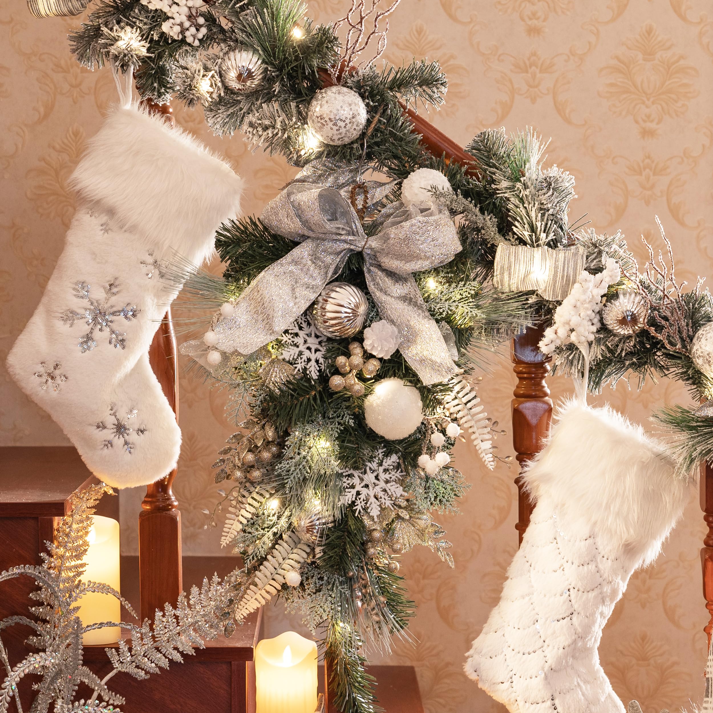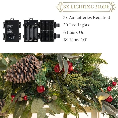 Boah, diese Weihnachtsgirlande bringt richtig Stimmung ins Haus! Der 25.6 Zoll (ca. 65cm) lange Teardrop-Swag ist voll mit silbernen Kugeln, Tannenzapfen und grünen Blättern - sieht mega edel aus. Mit 8 dimmbaren LED-Effekten kannst du die Stimmung genau anpassen. Batteriebetrieben (3x AA, nicht dabei) mit Timer: 6 Stunden an, 18 Stunden aus. Perfekt für Haustür, Kamin, Treppe oder Fenster. Die Handwerksqualität ist top - die Blätter fallen nicht ab und der Haken auf der Rückseite macht die Montage super einfach. Ob für drinnen oder draußen - diese Girlande sorgt für weihnachtliche Gemütlichkeit. Einfach aufhängen, Batterien rein und dich an der festlichen Atmosphäre erfreuen. Damit wird dein Zuhause zur Weihnachtsoase!
