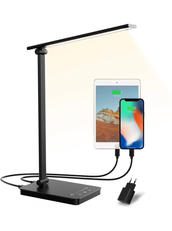 Die perfekte Beleuchtung für deinen Schreibtisch! Diese innovative Doppelkopf-Lampe eliminiert Schatten komplett - ideal zum Arbeiten, Lernen oder Lesen. Mit 5 Farbtemperaturen von warmem Entspannungslicht bis konzentriertem Tageslichtweiß und 10 Helligkeitsstufen. Die Lampe merkt sich deine Lieblingseinstellung und hat einen 45-Minuten Timer für entspanntes Einschlafen. Praktisch: Integrierter USB-Ausgang zum Laden deiner Geräte. Voll flexible Arme - du kannst das Licht genau dorthin lenken, wo du es brauchst. Perfekt für Home-Office, Studentenzimmer oder Nachttisch. Schone deine Augen und steigere deine Produktivität - mit dieser vielseitigen LED-Lampe!