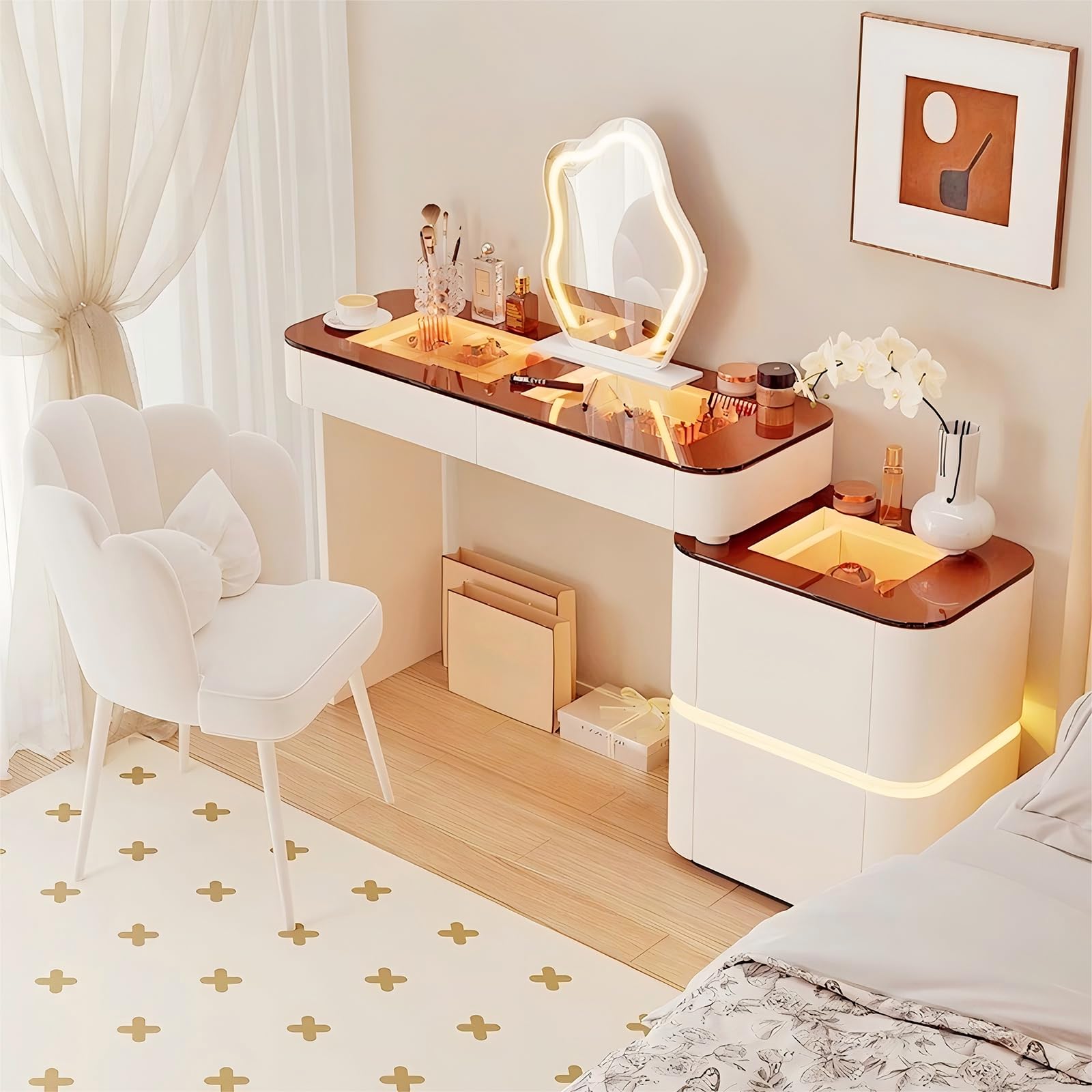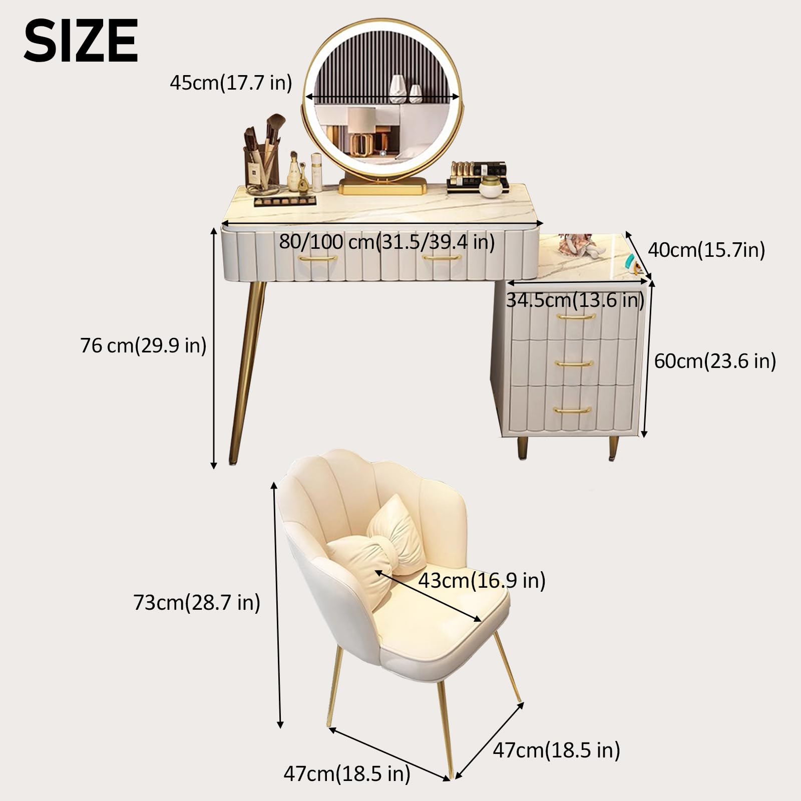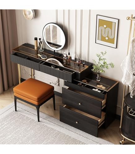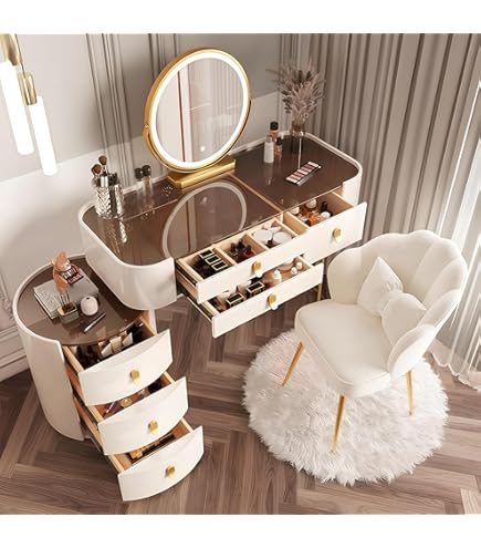Dein persönliches Beauty-Studio für Zuhause! Dieser wunderschöne Schminktisch kombiniert Stil und Funktionalität perfekt. Der 45 cm HD-Spiegel mit 3-farbiger LED-Beleuchtung (tageslicht, warm, kalt) sorgt für perfekte Ausleuchtung beim Schminken. 4 geräumige Schublaten bieten Platz für all deine Kosmetikprodukte. Der samtbezogene Stuhl macht das Beauty-Ritual zum absoluten Luxus-Erlebnis! Aus massivem Holz gefertigt, in verschiedenen Farben erhältlich. Die Montage ist supereinfach - in wenigen Schritten steht dein neuer Lieblingsplatz im Zimmer. Das perfekte Geschenk für jede Frau und jedes Mädchen!