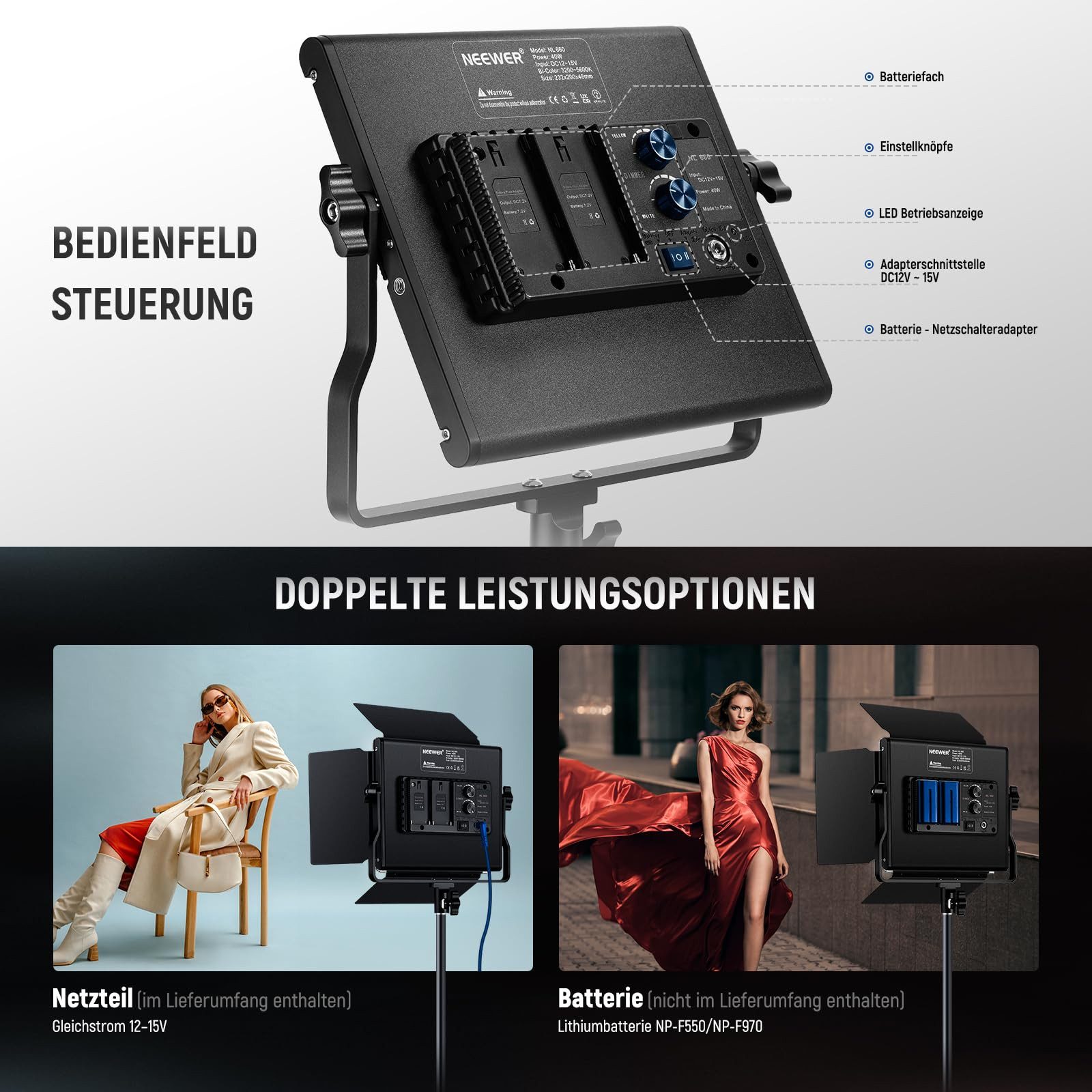 Professionelles Licht für deine Videos und Fotos! Dieses NEEWER LED Panel Set mit 192 LEDs liefert perfektes Licht für Streaming, YouTube, TikTok oder Portraitfotografie. Bi-Color von 3200K (warm) bis 5600K (kalt) stufenlos einstellbar, dazu dimmbare Helligkeit von 0-100%. Mit exzellentem CRI97+ für natürliche Farben. Das inkludierte Stativ ist von 54-178 cm höhenverstellbar, der Lichtkopf neigbar bis 180°. Zwei eingebaute 4000mAh Akkus ermöglichen bis zu 90 Minuten kabellosen Betrieb - perfekt für unterwegs. Mit LCD-Display für einfache Kontrolle. Die effiziente Wärmeableitung garantiert lange Lebensdauer. Alles, was du für professionelle Aufnahmen brauchst, in einem Set!