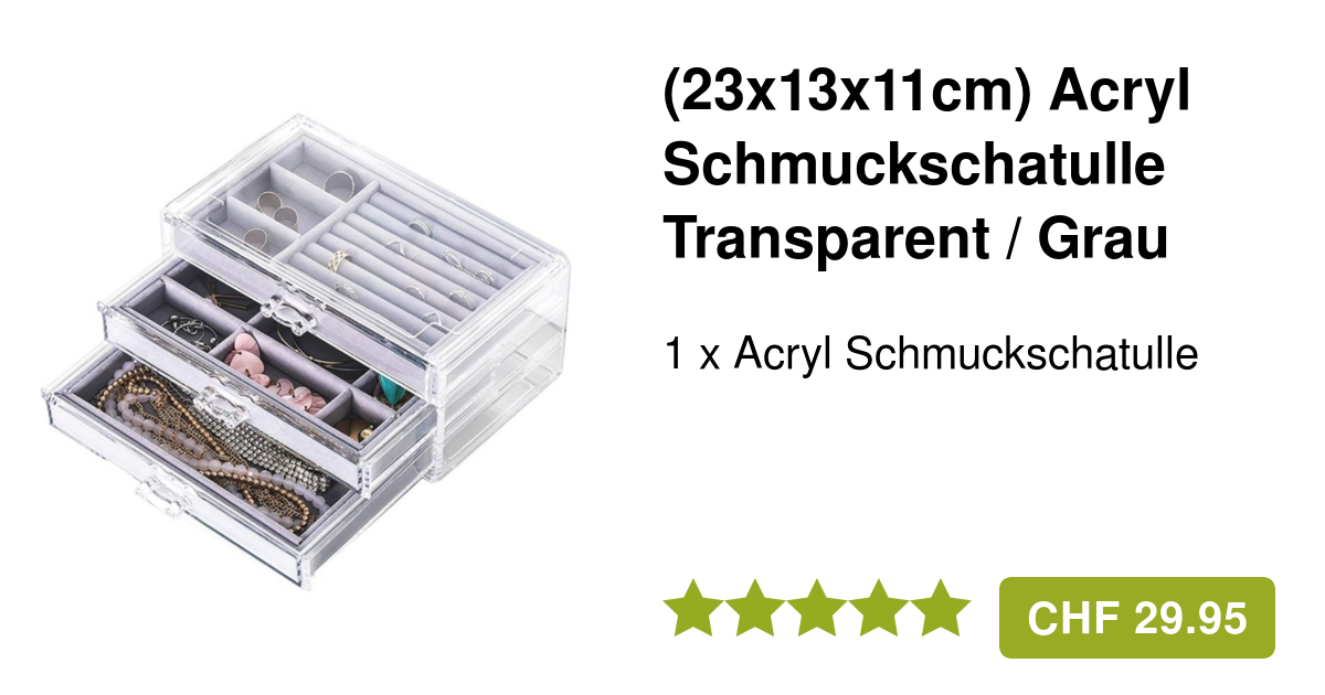 Aus stabilem Acryl das verschleißfest und wasserabweisend ist. Die transparenten Wände lassen dich sofort sehen was wo liegt - kein langes Suchen mehr vor dem Ausgehen.