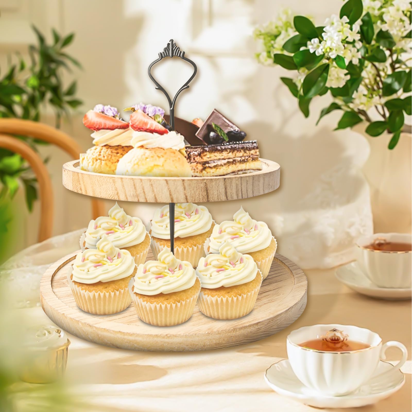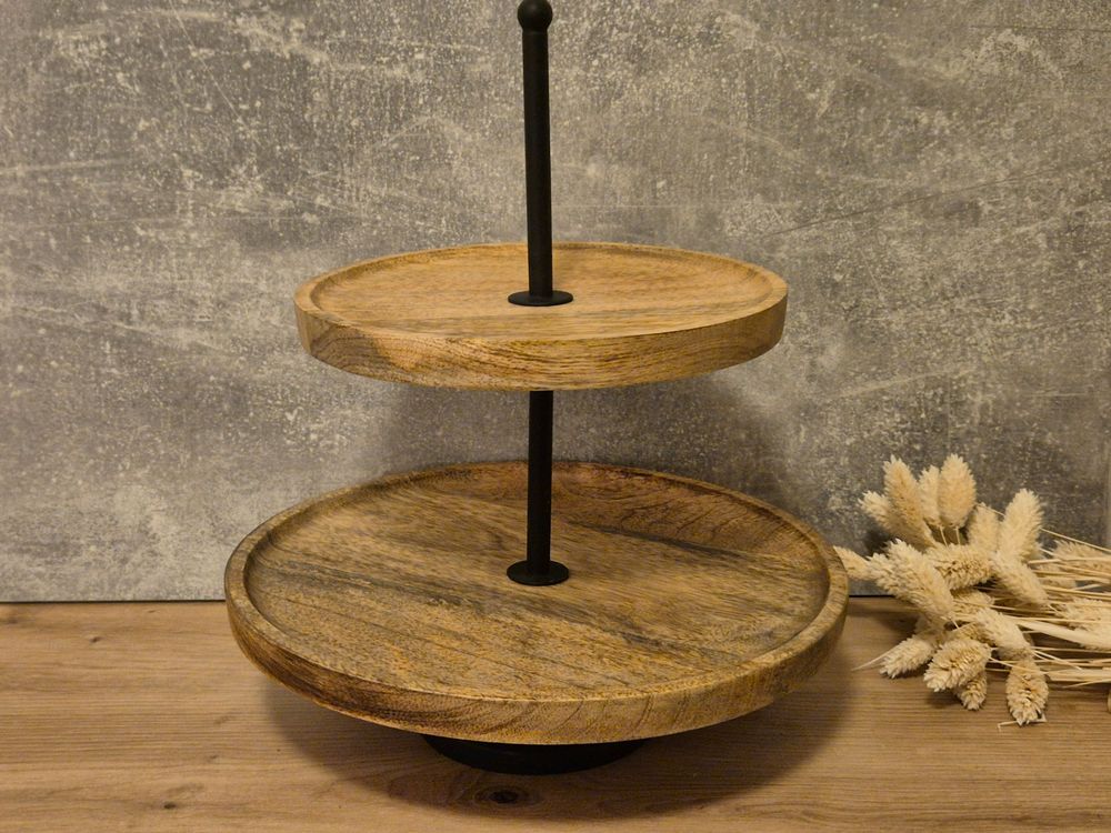Wow, diese Servieretagere bringt richtig Landhaus-Charme in dein Zuhause! Die 2-stöckige Holzetagere sieht nicht nur super aus, sondern ist auch mega praktisch.\n\nMaße:\n• Unteres Tablett: 33x33 cm\n• Oberes Tablett: 23x23 cm\n• Gesamthöhe: 46 cm\n• Abstand zwischen den Etagen: 16 cm\n\nDas Holz ist feuchtigkeitsresistent und verformt sich nicht - perfekt für feuchte Küchenumgebungen. Die Oberfläche ist glatt und leicht zu reinigen: Einfach mit einem feuchten Tuch abwischen und trocknen lassen.\n\nSuper für:\n• Cupcakes und Torten\n• Obst und Snacks\n• Desserts und Gebäck\n• Deko-Artikel\n• Kerzen und Blumen\n\nDer praktische Tragering oben macht das Transportieren super einfach. Ob vom Küchenschrank zum Esstisch oder für die Gartenparty - alles kein Problem!\n\nDas vintage Design passt perfekt zu:\n• Weihnachtsdekoration\n• Osterfeiern\n• Geburtstagspartys\n• Hochzeiten\n• Täglicher Tischdekoration\n\nStell dir vor: Du präsentierst deine selbstgebackenen Cupcakes auf dieser süßen Etagere - das sieht nicht nur hübsch aus, sondern deine Gäste werden begeistert sein!\n\nHol dir diesen rustikalen Hingucker und verwandle deine nächste Feier in ein echtes Erlebnis. Landhaus-Flair pur!