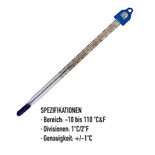Dieses klassische Laborthermometer ist ein echter Allrounder für Haushalt und Hobby! Mit einer Länge von 300mm und einem Messbereich von -10°C bis +150°C ist es perfekt zum Eintauchen in Flüssigkeiten. Die rote Spitze macht die Ablesung super einfach. Ob für die Küche, den Heimbierbrauer oder für Schulprojekte - dieses Thermometer liefert zuverlässige Ergebnisse. Einfach, aber effektiv - genau das, was man braucht!