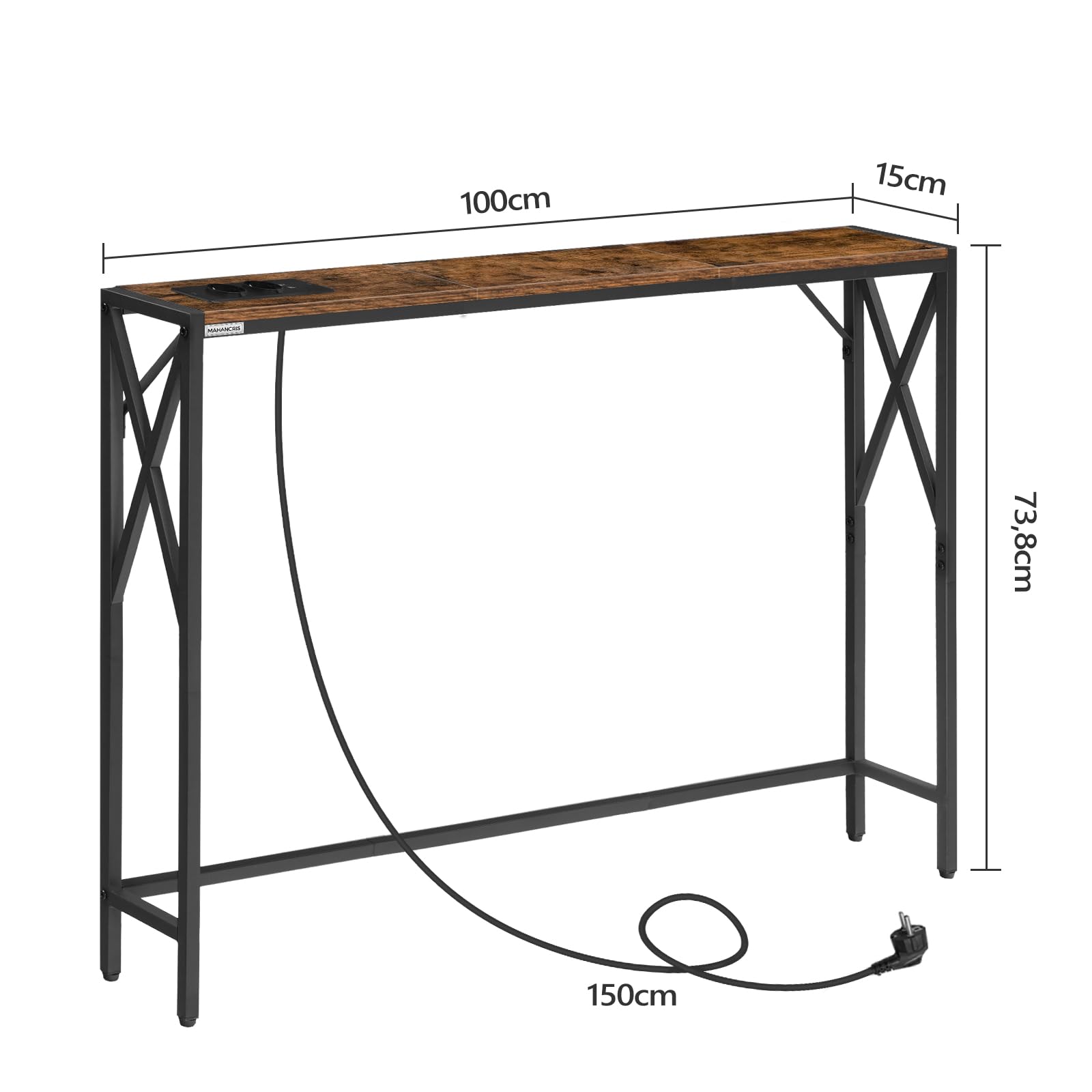 Mega praktisch dieser Konsolentisch! Nur 100cm schmal - passt perfekt in den Flur oder hinter's Sofa. Und er hat eingebaute Steckdosen: 2 normale Steckdosen und 2 USB-Anschlüsse! Damit kannst du handy, Tablet und Co. direkt beim Tisch aufladen. Das 2 Meter lange Kabel gibt genug Spielraum. Aus massivem Holz in Vintage-Braun - sieht total edel aus mit der natürlichen Maserung. Die Tischbeine sind höhenverstellbar, super für unebene Böden. Trägt bis zu 102kg - richtig stabil! Mit Kippschutz für extra Sicherheit. Einfach zusammenzubauen und leicht zu reinigen - einfach mit feuchtem Tuch abwischen. Perfekt als Ablage für Schlüssel, Post oder Deko. Ob im Flur, Wohnzimmer oder als Sofatisch - dieser Tisch ist einfach vielseitig. Endlich ein schicker Tisch mit praktischer Ladefunktion!
