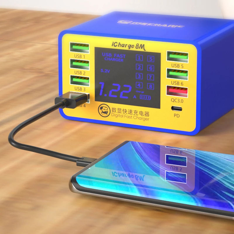 Endlich Schluss mit dem Ladekabel-Chaos! Diese 8-in-1 USB Ladestation ist dein neuer bester Freund für unterwegs und zuhause. Mit 4 USB-C und 4 normalen USB Ports kannst du gleichzeitig fast alle deine Geräte laden - Handy, Tablet, Laptop, Kopfhörer, was auch immer. \\n\\nDas coole Feature: Die intelligente Stromverteilung gibt jedem Gerät genau die Power, die es braucht. Und keine Sorge wenn's mal spritzt - mit IPX4 ist die Station spritzwassergeschützt. Perfekt also fürs Badezimmer oder die Küche. \\n\\nWas du wissen solltest: \\n• Eingangsspannung: 100-240V (geht also weltweit) \\n• Max. Leistung pro Port: 5V/3A \\n• Unterstützt Quick Charge 3.0 und Power Delivery \\n• Voll mit Schutzfunktionen: Überlastung, Überspannung, Kurzschluss \\n• Maße: nur 3,2 x 6,3 x 7,88 cm - passt in jede Reisetasche \\n\\nEinfach ins Reisegepäck werfen und du bist immer powered. Die gummierten Füße sorgen dafür, dass das Teil nicht rutscht. Wirklich praktisch!