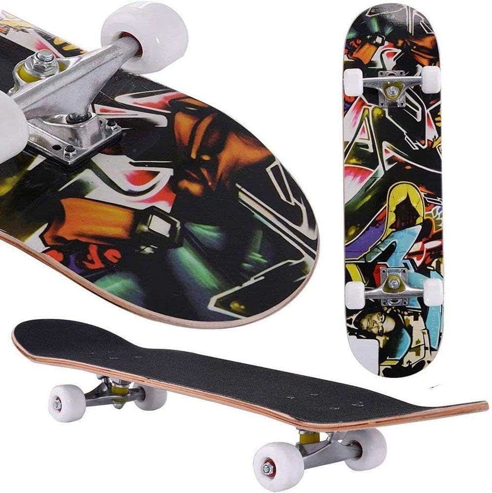 Ab aufs Board und los geht's! Dieses komplette Skateboard ist sofort einsatzbereit und perfekt für Einsteiger und Fortgeschrittene. Mit 31 Zoll (79,5 cm) Länge und 20 cm Breite bietet es genug Fläche für sicheren Stand. Das Deck aus 7 Lagen Ahornholz ist super stabil und langlebig - hält auch härteren Landungen stand. Das konkave Design mit doppeltem Tritt gibt dir volle Kontrolle beim Fahren und Bremsen. Ausgestattet mit qualitativ hochwertigen ABEC-7 Kugellagern für schnelles und leises Fahren. Die 85A PU-Rollen und HR-95A Stoßdämpfer sorgen für griffigen Halt und komfortable Fahrten. Der Aluminium-Truck ist robust und langlebig. Das coole Graffiti-Letter-Design wird durch Wärmeübertragung aufgedruckt und hält auch bei intensiver Nutzung. Das matte, wasserfeste Schleifpapier auf dem Deck gibt dir sicheren Halt. Perfekt für Skateparks, Straßen, Rampen oder einfach zum Cruisen durch die Stadt. Komplett vormontiert geliefert - einfach auspacken und losfahren. Ein ideales Geschenk für Jugendliche, die Action und Freiheit lieben. Ob für Tricks oder einfach nur zum Fahren - dieses Board macht einfach Spaß!