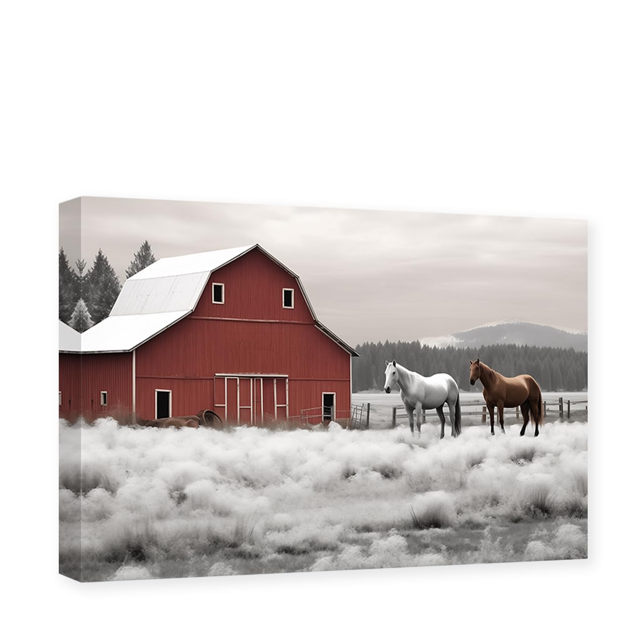 Bauernhaus Leinwandbild 40x60cm - Landschaft Kunst Mit Scheune Pferd Sonnenuntergang