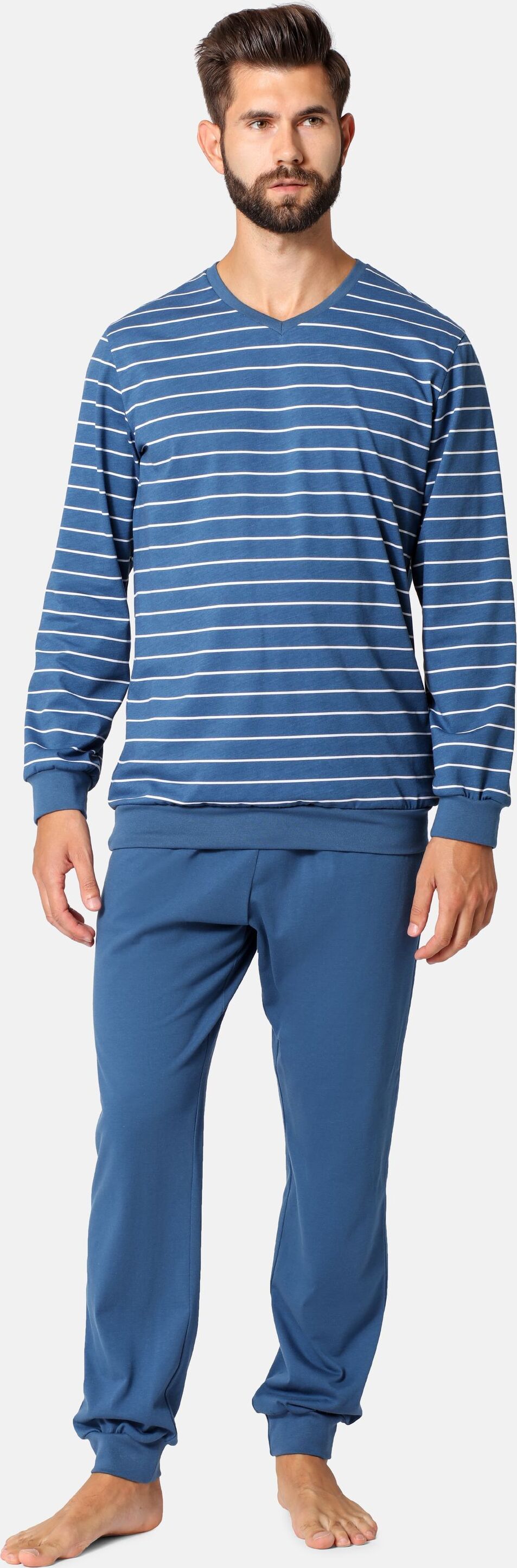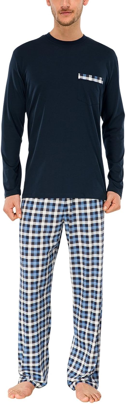 Dieser Herren-Schlafanzug ist einfach super gemütlich! Aus 95% Baumwolle und 5% Elasthan - weich, atmungsaktiv und dehnbar. Das Set besteht aus einem einfarbigen Langarm-Shirt mit Rundhalsausschnitt und einer karierten Hose. Die Hose hat einen elastischen Bund mit Kordelzug für perfekte Passform. Praktisch: Zwei Seitentaschen für Handy oder Schlüssel. Perfekt für erholsame Nächte oder entspannte Tage zu Hause. Auch gut für kurze Gänge mit dem Hund oder zum Lesen auf der Couch. Zeitloses Design passt zu Männern jeden Alters. Ein tolles Geschenk für Ehemann, Vater oder Freund! Einfach in der Maschine waschbar - nicht bleichen. Wähle einfach deine Größe und genieße den Komfort!