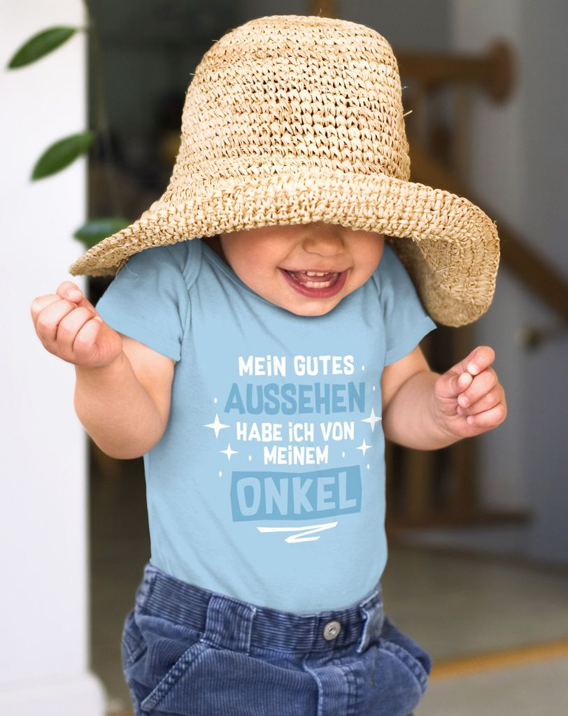 Auf der Suche nach einem lustigen Geschenk für den stolzen Onkel? Dieser Babybody mit dem Spruch 'Mein gutes Aussehen habe ich von meinem Onkel' ist einfach niedlich! Hergestellt aus 100% gekämmter Bio-Baumwolle ist er super weich und angenehm auf der zarten Babyhaut. Der Envelope-Halsausschnitt macht das Anziehen super einfach und die nickelfreien Druckknöpfe sind absolut unbedenklich. Perfekt für Jungen und Mädchen von 0-6 Monaten. Ein ideales Geschenk zur Geburt oder für den Patentonkel! Einfach bei 30°C waschen und dem kleinen Schatz beim Strahlen zusehen. Diesen Body will jeder Onkel haben!