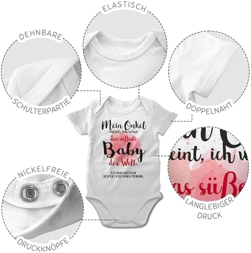Dieser niedliche Babybody bringt jeden zum Lachen! Mit dem lustigen Spruch 'Süß, schlau und witzig - wie mein Onkel eben' ist er das perfekte Geschenk für stolze Onkel. Hergestellt aus 100% Bio-Baumwolle, besonders weich und hautfreundlich für zarte Babyhaut. Der Envelope-Halsausschnitt und die nickelfreien Druckknöpfe machen das An- und Ausziehen super einfach. Perfekt für Jungen und Mädchen gleichermaßen. Bei 30°C in der Maschine waschbar und dabei formstabil. Ob zur Familienfeier oder einfach für den Alltag - dieser Body ist ein absoluter Hingucker und sorgt garantiert für schöne Fotos und strahlende Gesichter!