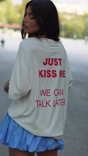 Verliebt? Dieses süße Tank Top spricht Bände! Mit dem Spruch 'Just kiss me we can talk later' und coolen Kuss-Motiven. Perfekt für den Valentinstag - ob für dich oder als Geschenk für deinen Liebsten. Aus leichtem Material und klassisch geschnitten - sitzt super! Doppelt genähte Säume - hält auch beim häufigen Tragen. Ob zum Date, Festival oder einfach casual - dieses Shirt macht immer was her. Zeig deine romantische Ader ohne viele Worte! Einfach anziehen und Komplimente kassieren. Mach deinen Valentinstag unvergesslich mit diesem niedlichen Shirt!