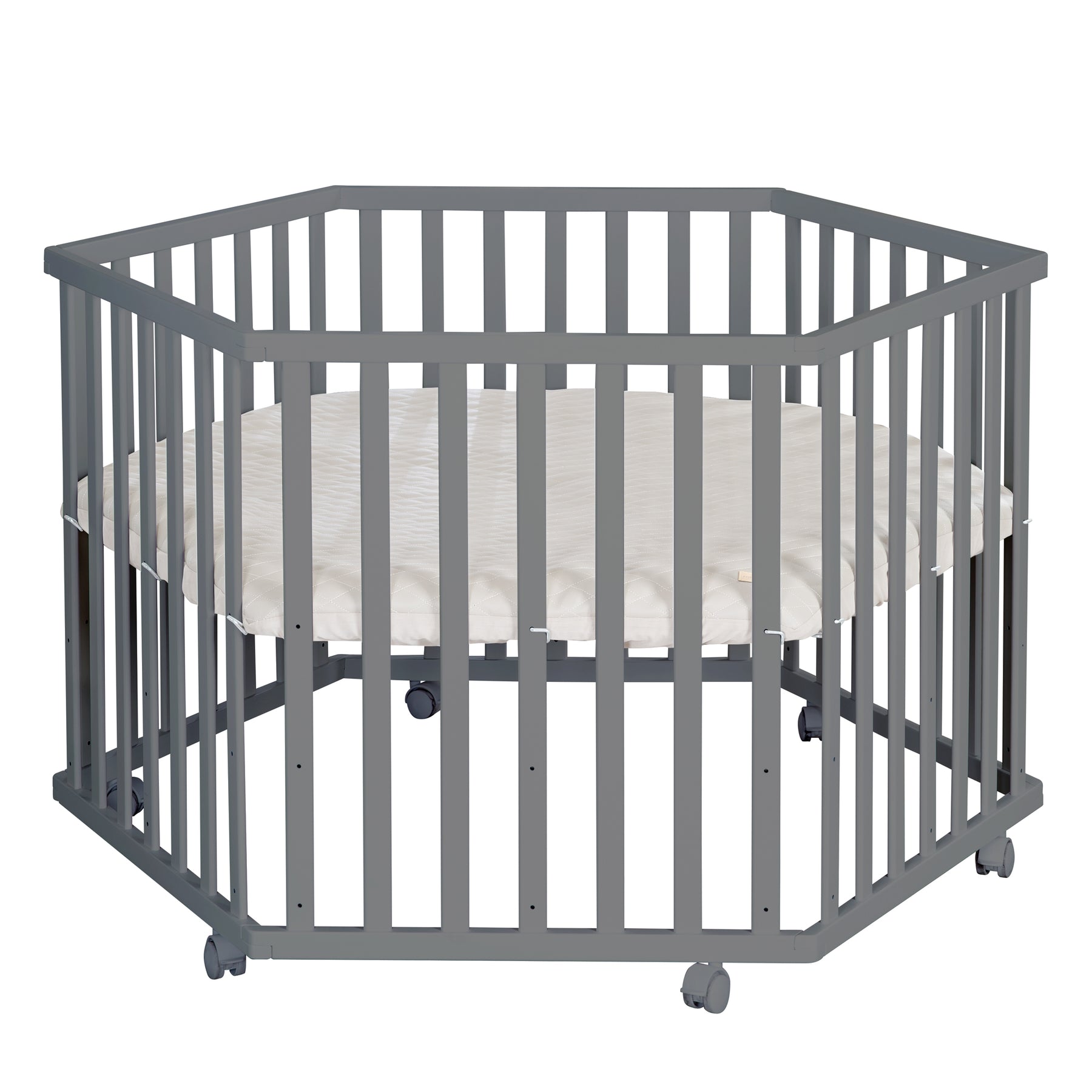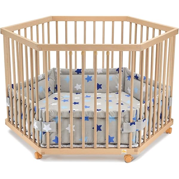 Sicherer Spielraum für dein Kleines! Dieses 6-eckige Laufgitter aus massivem Buchenholz bietet mit 115x100 cm Innenmaß jede Menge Platz zum Spielen und Entdecken. Der Boden ist stufenlos höhenverstellbar und wächst so mit deinem Baby mit. Die gepolsterte, abwischbare Einlage mit süßen grauen Sternen auf weiß ist praktisch und sieht toll aus. Mit 4 Schlupfsprossen kommt dein Kind easy rein und raus, während 6 arretierbare Rollen für Mobilität und Stabilität sorgen. Nach DIN EN 12227:2010 gefertigt und mit speichelfestem Lack - so macht Spielen auch den Eltern Spaß!