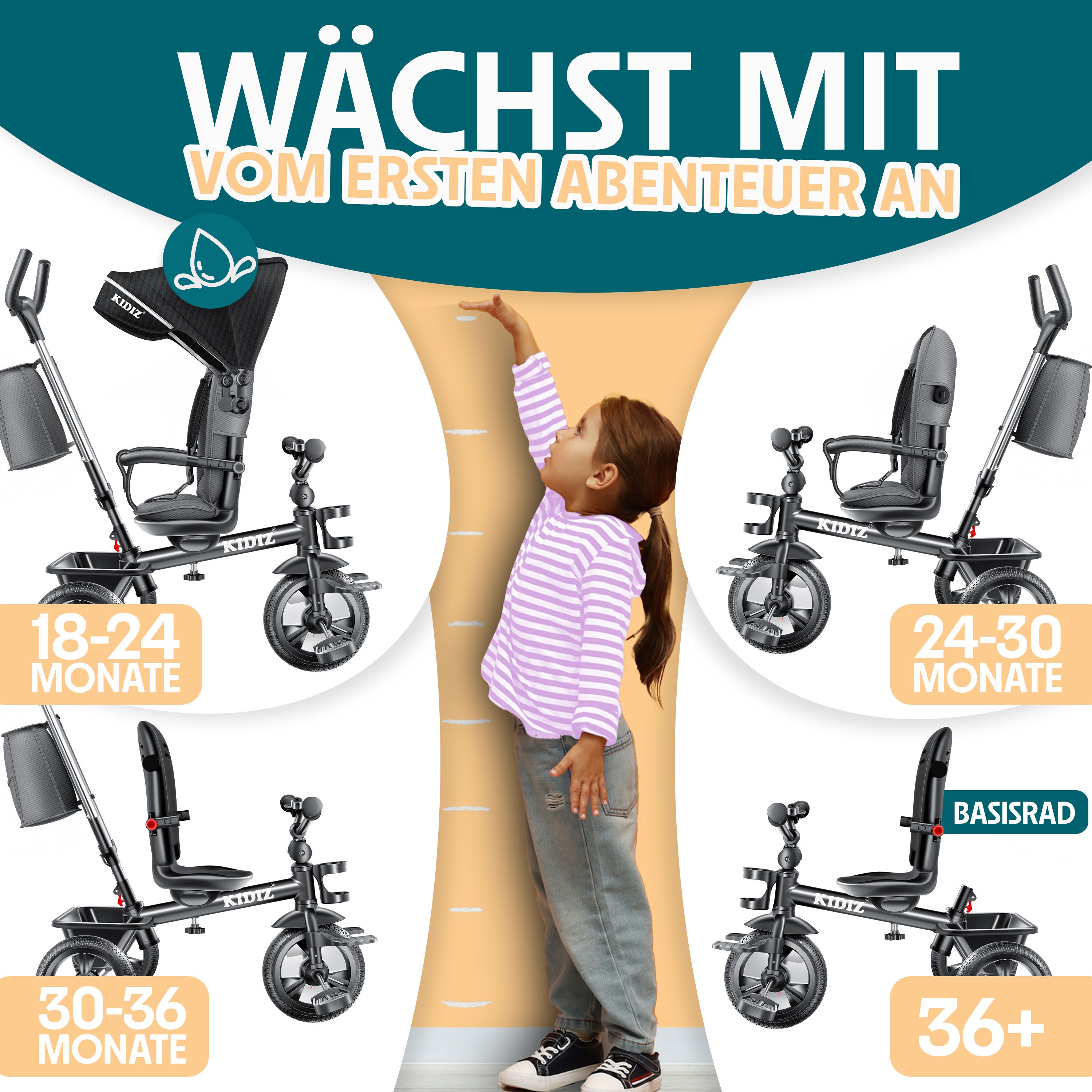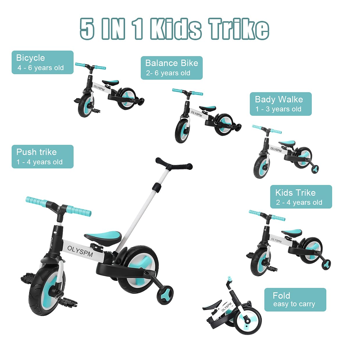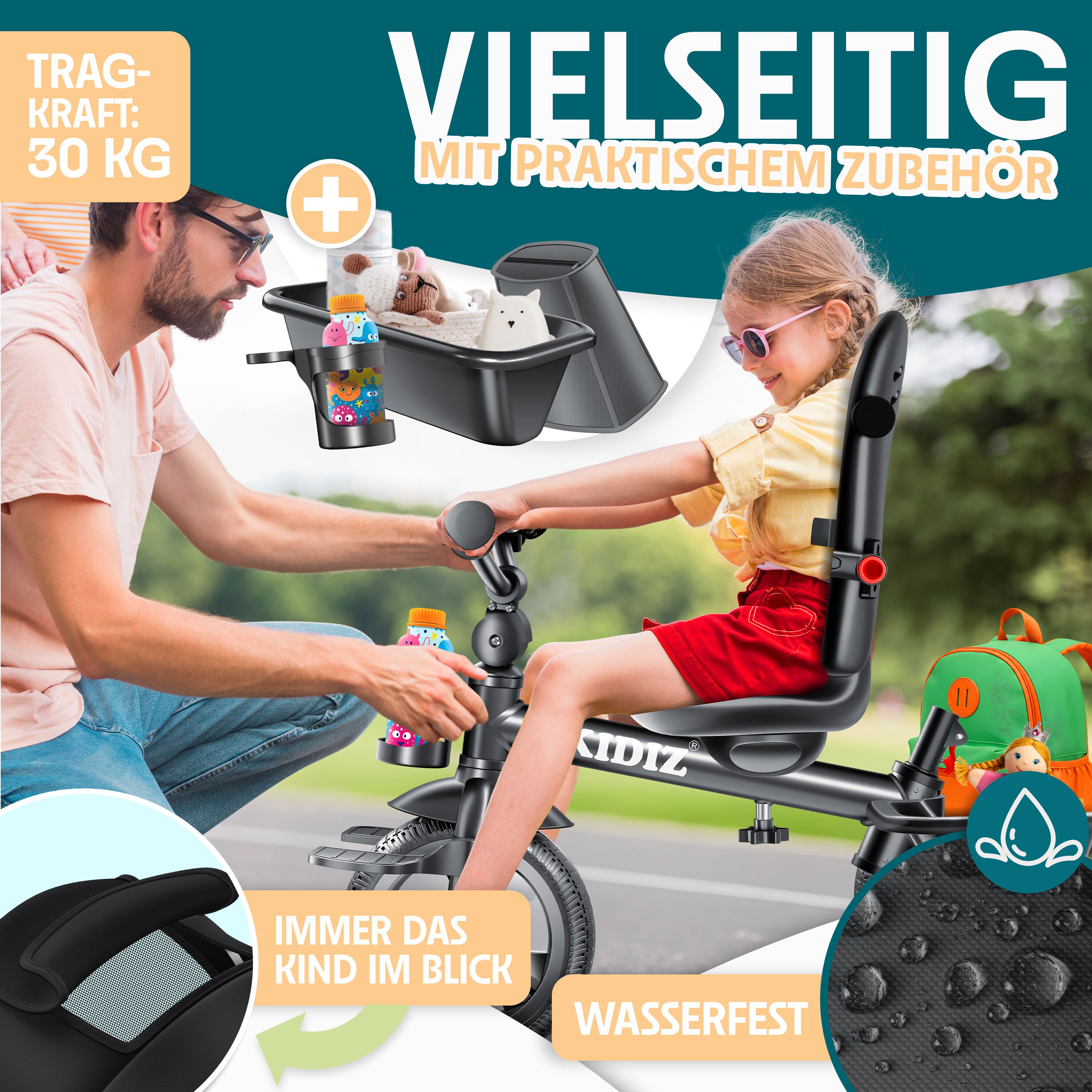 Dieses 5-in-1 Dreirad wächst mit deinem Kind mit! Für Kinder von 1 bis 4 Jahren geeignet und bis 15 kg belastbar. Fünf Modi in einem: Vom Schiebedreirad mit Sicherheitsbügel über Laufrad bis zum richtigen Dreirad mit Pedalen. Die höhenverstellbaren Sitze und Griffe passen sich perfekt der Größe deines Kindes an. Super praktisch: Abnehmbare Pedale und klappbarer Schiebegriff. Die großen EVA-Räder sind leise, stoßfest und rollen super weich. Der stabile Stahlrahmen und das dreieckige Design sorgen für Sicherheit. Der Lenker ist auf 71° beschränkt, damit's nicht umkippt. Fördert spielerisch Gleichgewicht und Koordination. Einfach zu montieren und platzsparend zu verstauen. Perfekt für drinnen und draußen! Damit macht dein Kind seine ersten Fahrversuche sicher und mit viel Spaß. Ein Begleiter für Jahre - vom Laufen lernen bis zum selbstständigen Fahren!