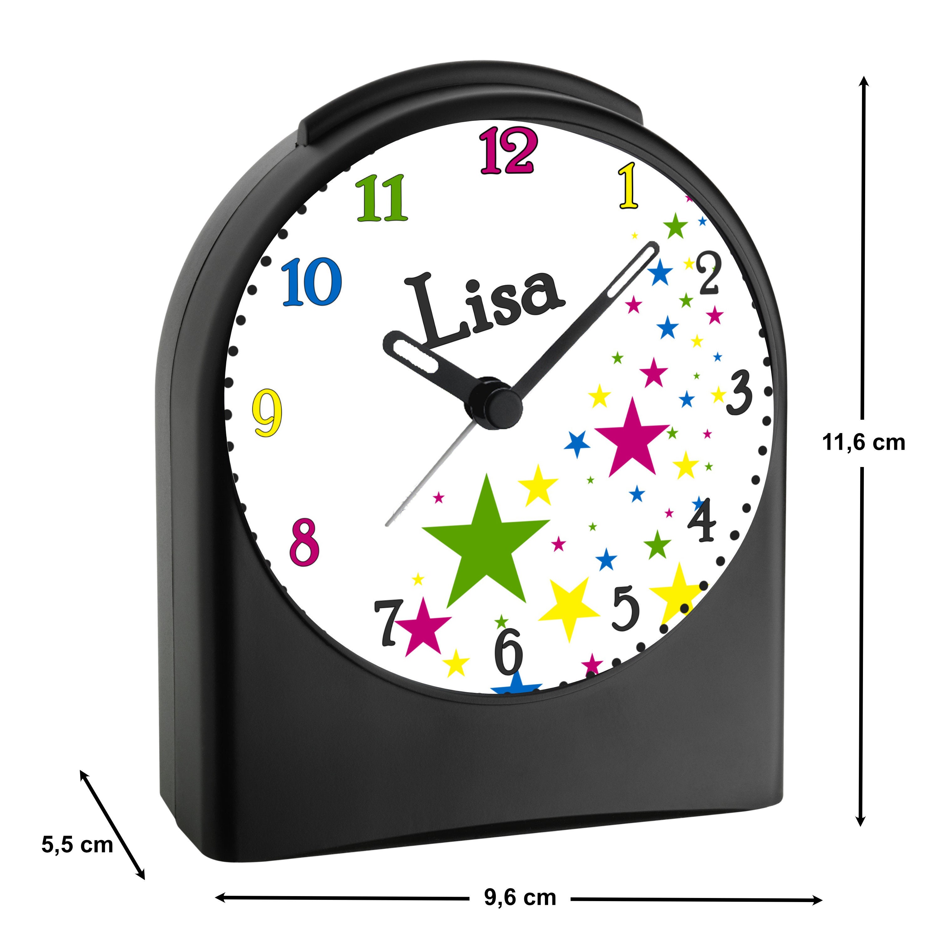 Der perfekte Weckbegleiter fürs Kinderzimmer! Dieser süße analoge Wecker wird mit dem Namen deines Kindes personalisiert - ein echter Hingucker. Dank DCF-Funktechnik zeigt er immer die exakte Zeit an und stellt sich sogar automatisch auf Sommer-/Winterzeit um. Absolut lautlos durch fehlenden Sekundenzeiger, mit sanftem Weckalarm der langsam lauter wird. Beleuchtetes Ziffernblatt für die Nacht, Snooze-Funktion fürs Aufstehen. Maße: 9,6x5,5x11,9cm. Benötigt 1 AA Batterie (nicht inklusive).