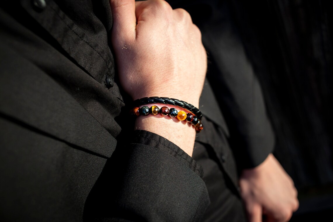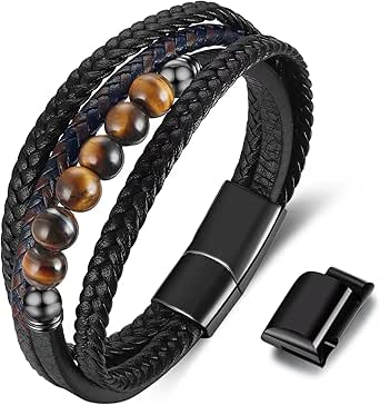 Stylish unterwegs! Dieses 2er Set Lederarmbänder für Herren ist einfach nur klasse. Ein Armband mit echten Tigerauge-Perlen, das andere mit Lavastein - beide sehen mega aus! Länge: 21cm - passt für Handgelenke 17-21cm. Aus hochwertigem Leder - weich und hautfreundlich. Mit Legierungs-Schnalle - einfach anzulegen und sicher. Perfektes Geschenk für Vater, Freund, Kollegen - zu Geburtstag, Weihnachten oder einfach so. Kombinierbar mit jedem Outfit - ob casual oder business. Leicht und komfortabel - trägst du den ganzen Tag. Mach dich zum Style-König - mit diesen edlen Armbändern. Einfach bestellen und beeindrucken - das perfekte Accessoire für den modernen Mann!