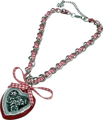 Wunderschöne Trachtenkette für dein Dirndl-Outfit! Mit süßem Lebkuchenherz-Anhänger (5,5cm) und praktischem Edelweiß-Karabinerverschluss. Das doppelreihige Polyesterband ist 45-50cm lang inklusive Verlängerungskette - passt also immer perfekt. Klassischer Dirndlschmuck, der zu Lederhose, Trachtenbluse und jedem Oktoberfest-Outfit super aussieht. Hochwertige Verarbeitung und ein echter Hingucker. Macht jedes Trachten-Outfit komplett und ist ein tolles Geschenk für Volksfest-Fans!
