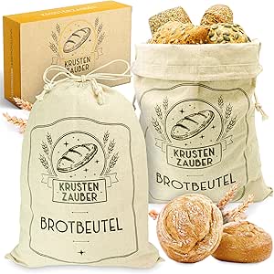 Praktische Brotbeutel aus natürlichem Leinen - perfekt für alle, die Wert auf Nachhaltigkeit legen! Das 2er-Set enthält einen großen Beutel (32x42cm) für Baguettes, Sauerteigbrote oder mehrere Brotscheiben und einen kleinen (18x18cm) als Sauerteigschüssel-Deckel. Die Innenseite ist mit essbarem Bienenwachs beschichtet - hält dein Brot länger frisch, atmungsaktiv und schimmelfrei. Mit praktischem Gummiband und Karabiner zum Aufhängen oder Tragen. Einfach per Hand in kaltem Wasser bei 30°C waschbar und immer wieder verwendbar. Die perfekte Zero-Waste Alternative zu Plastiktüten! Ob für selbstgebackenes Brot, vom Bäcker oder für Backwaren - diese Beutel sind deine besten Begleiter für frische Köstlichkeiten. Ein super Geschenk für Backbegeisterte und Umweltbewusste!
