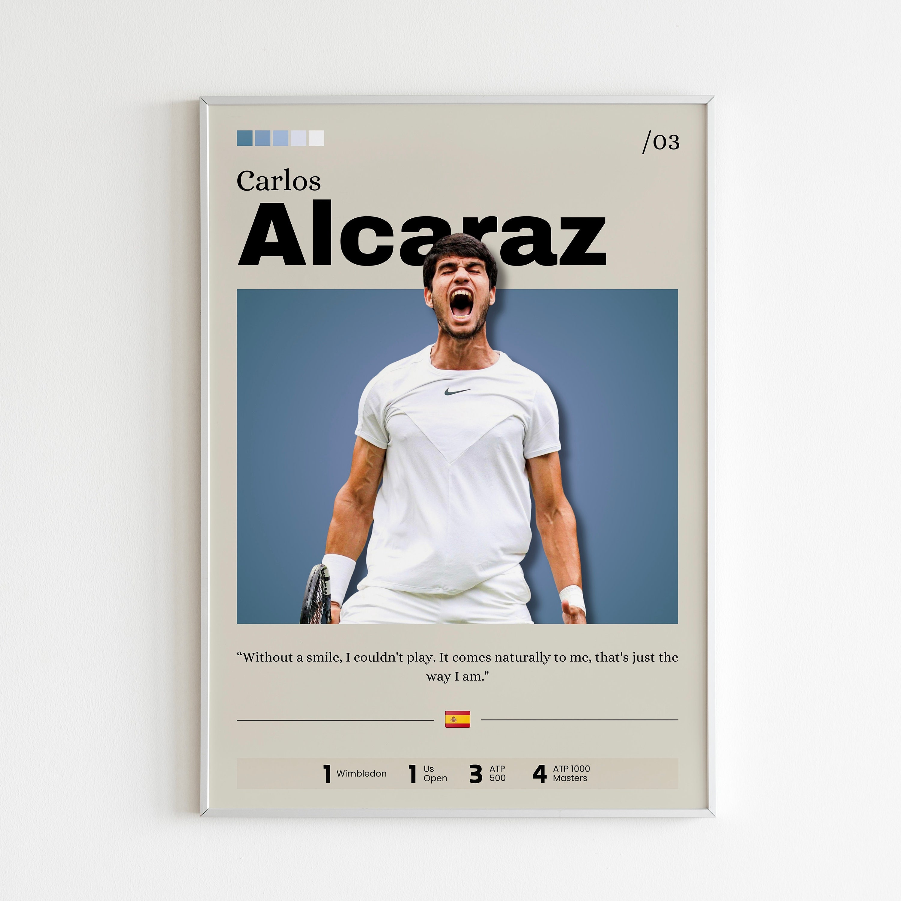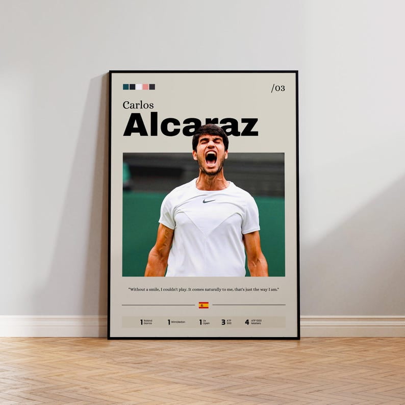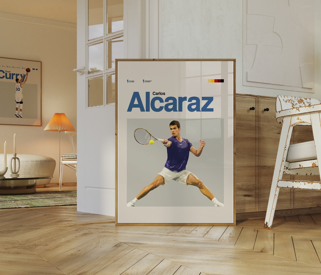 Tennis-Fans und Carlos Alcaraz-Begeisterte - dieses Poster ist ein absoluter Hingucker! In 60x90cm Größe passt es perfekt an jede Wand im Wohnzimmer, Jugendzimmer oder Büro. Auf hochwertiger Leinwand gedruckt - sieht viel edler aus als normale Papier-Poster.\n\nDie Farben sind kräftig und lebendig, gedruckt mit professioneller Tintenstrahl-Technologie. Jedes Stück wird von Hand geprüft - Qualität die man sieht. Modern, stylisch und voller Energie - genau wie der Tennis-Star selbst!\n\nEinfach aufhängen und deine Wände kommen sofort in Bewegung. Perfekt als Geschenk für Tennis-Liebhaber oder um dein eigenes Zuhause aufzupeppen. Ein Statement-Piece das garantiert Gesprächsthema wird!