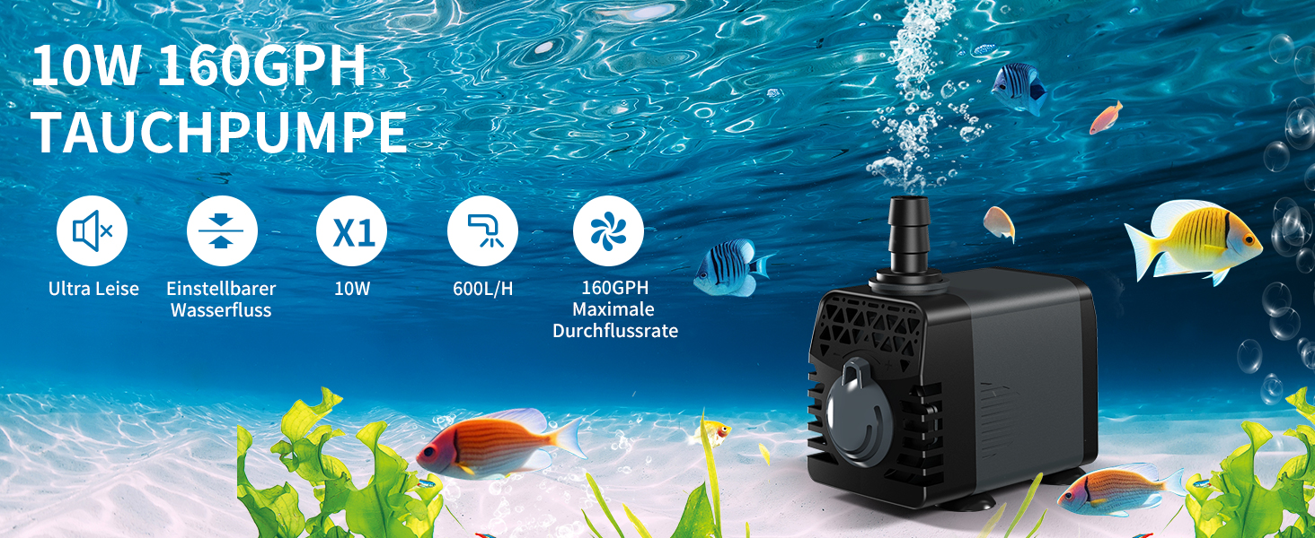 Ankway Springbrunnenpumpe 10W 600L/H - Ultra Leise Aquarium Pumpe Mit 2 Düsen