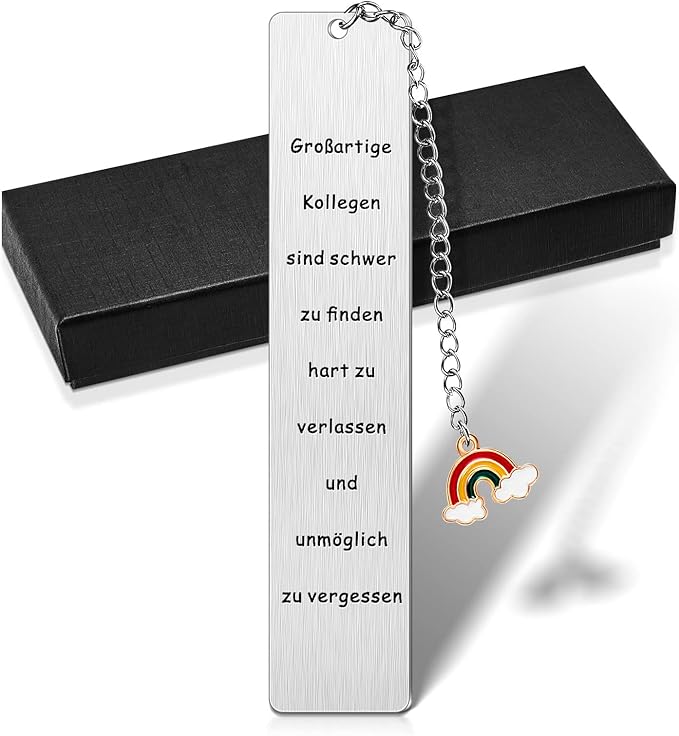 Eine bleibende Erinnerung zum Danke sagen! Dieses edle 6-teilige Lesezeichen-Set aus Metall ist das perfekte Dankesgeschenk für Lehrer, Erzieher oder liebe Kollegen. Jedes Lesezeichen (13x2,6cm) ist mit herzlichen Sprüchen graviert wie 'Danke, dass du ein Teil meiner Geschichte bist'. Komplett mit 6 passenden Geschenkboxen (14,5x4,5x1,8cm) - sofort verschenkfertig! Aus robustem Edelstahl, nicht verformbar und langlebig. Die bunten Drucke und einzigartigen Motive machen jedes Lesezeichen zu einem kleinen Kunstwerk. Ideal für Abschiede, Geburtstage, Weihnachten oder einfach um Danke zu sagen!