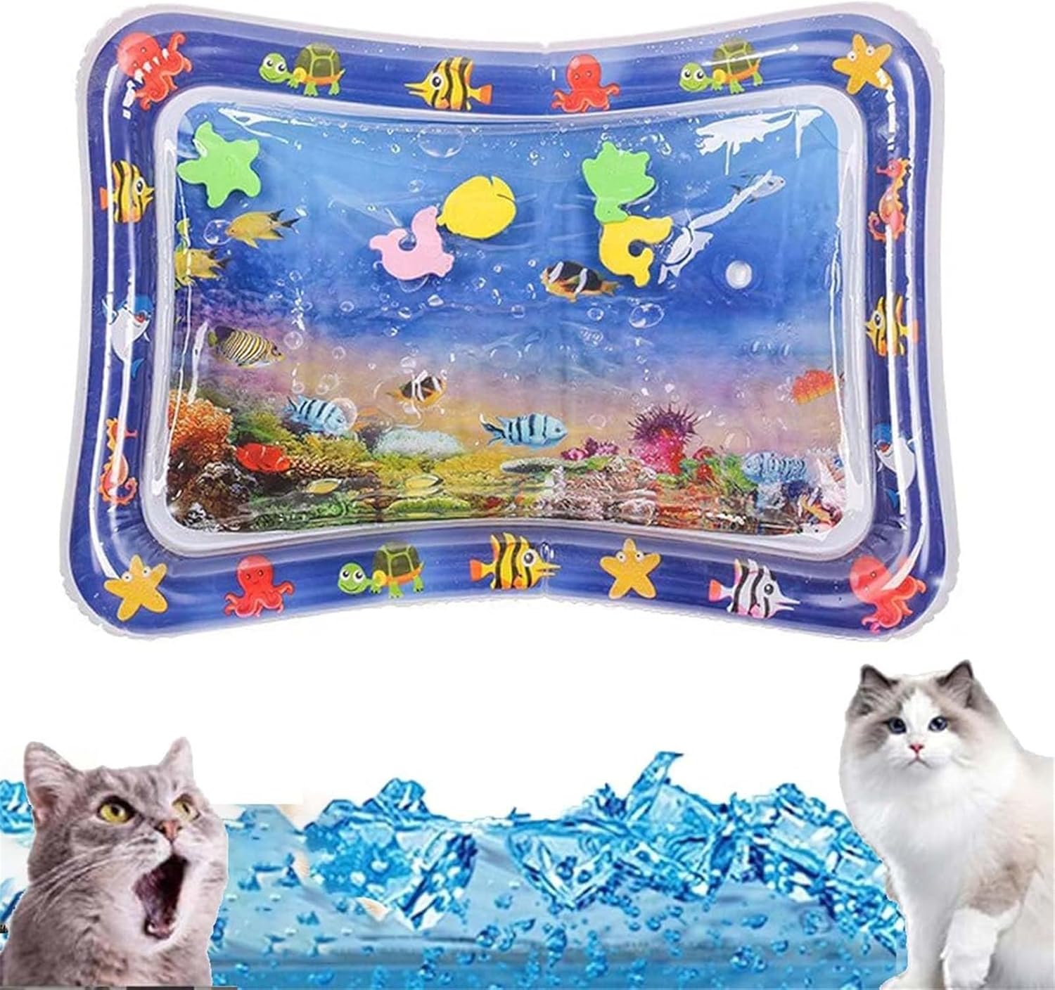 Hey, diese coole Wassermatte macht deiner Katze richtig Spaß! Bei dem heißen Wetter ist sie die perfekte Abkühlung. Das Beste: Sie hat einen eingebauten Sensor, der auf Berührung reagiert - total faszinierend für neugierige Samtpfoten.\\n\\nDie Matte ist aus weichem PVC gemacht, komplett umweltfreundlich und hält auch wilderen Spielaktionen stand. Sie zeigt eine bunte Unterwasserwelt, die deine Katze garantiert neugierig macht. Aufbauen ist super einfach: Du kannst sie entweder aufblasen oder mit Wasser füllen - je nachdem, was dir lieber ist. Und keine Sorge, sie ist absolut dicht!\\n\\nMit 65cm Durchmesser hat deine Katze genug Platz zum Spielen. Übrigens: Nicht nur Katzen lieben sie, auch Hunde und sogar Kinder haben ihren Spaß damit. Perfekt für den Garten, den Balkon oder drinnen - überall wo deine Tiere Action wollen.\\n\\nKleiner Tipp: Pass mit scharfen Gegenständen auf, damit die Matte schön dicht bleibt. So hast du lange Freude an dem coolen Spielzeug!