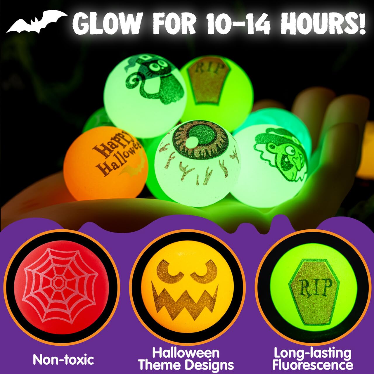 Mach deine Halloween-Party unvergesslich! 🎃 Diese 24 leuchtenden Gummibälle sind der absolute Hit für große und kleine Gruselfans.\n\nJeder Ball hat coole Halloween-Motive - mal grinst dich ein Kürbis an, mal fliegt eine Hexe vorbei. Und das Beste: Die Bälle leuchten im Dunkeln! Einfach vorher ans Licht halten und schon glühen sie gruselig schön.\n\nSuper für die Halloween-Tüten: Einfach ein paar Bälle zu den Süßigkeiten stecken und die Kids werden begeistert sein. Oder du verteilst sie als kleine Preise bei Spielen.\n\nDie Bälle sind aus robustem Gummi, springen super hoch und gehen nicht so schnell kaputt. Mit etwa 2,7 cm Durchmesser passen sie perfekt in Kinderhände.\n\nPerfekt für:\n• Halloween-Partys\n• Süßes-oder-Saures-Tüten\n• Schulfeiern\n• Kindergeburtstage\n\nAchtung: Kann Suchtgefahr verursachen - die Dinger machen einfach zu viel Spaß! 😉