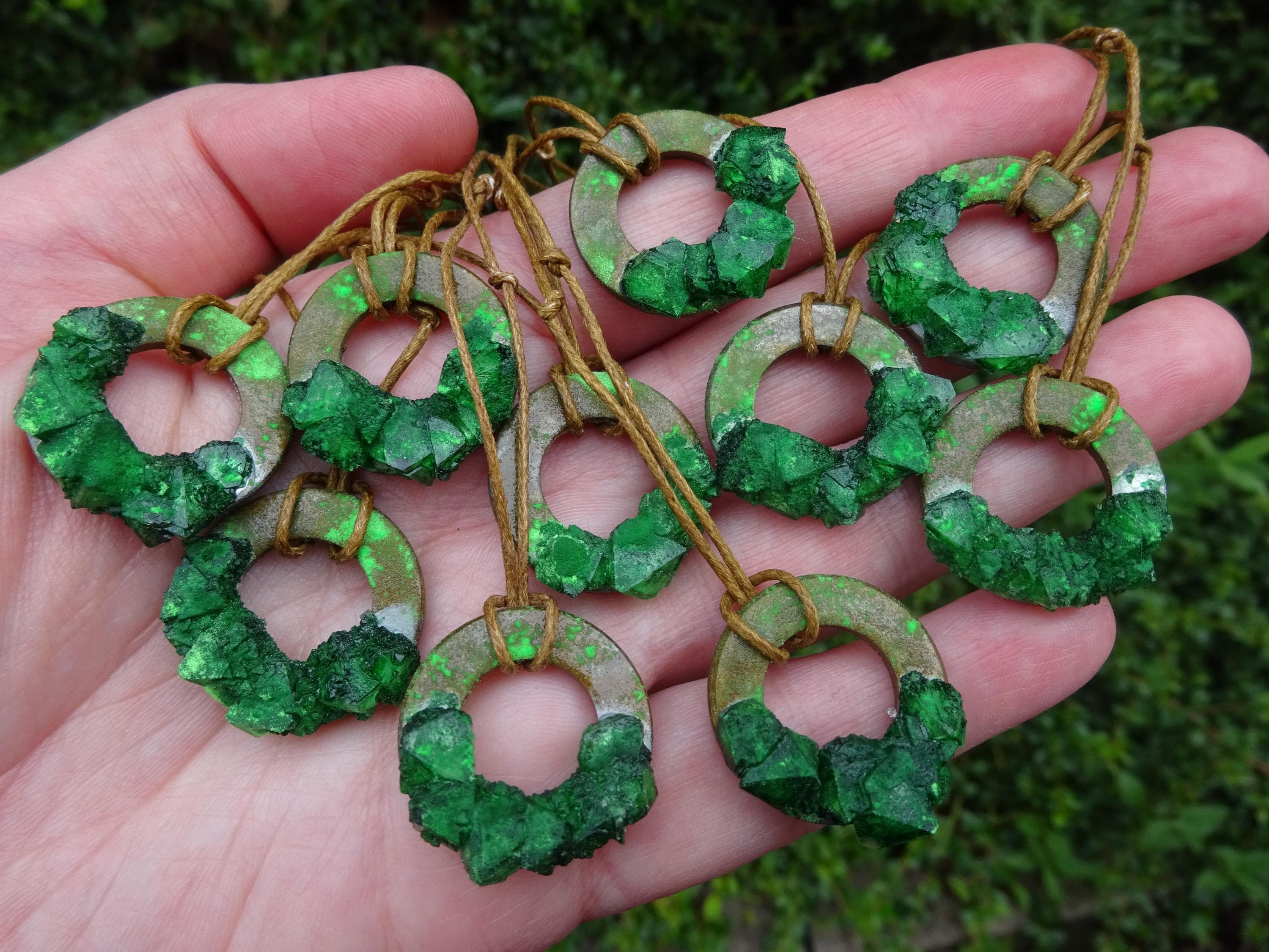 Wow, dieser Anhänger leuchtet im Dunkeln! Jedes Stück ist ein Unikat, handgefertigt aus hochwertigem Epoxidharz. Der etwa 5cm lange Kristall-Anhänger wird mit einer 40cm Edelstahl-Kette geliefert - perfekt für empfindliche Haut. Nach dem Aufladen mit Sonnenlicht oder (noch besser) Schwarzlicht leuchtet er in einem magischen Grün. Ideal für Cosplay, Mittelalter-Märkte, Gothic-Events oder einfach als besonderes Alltags-Accessoire. Jede Kette wird individuell auf Bestellung angefertigt - du bekommst also ein absolutes Einzelstück! Perfekt als Geschenk für Menschen, die das Besondere lieben. Ob für Hexen, Fantasy-Fans oder einfach für alle, die außergewöhnlichen Schmuck mögen - dieser leuchtende Kristall ist garantiert ein Hingucker. Tauche ein in eine magische Welt mit diesem einzigartigen Schmuckstück!
