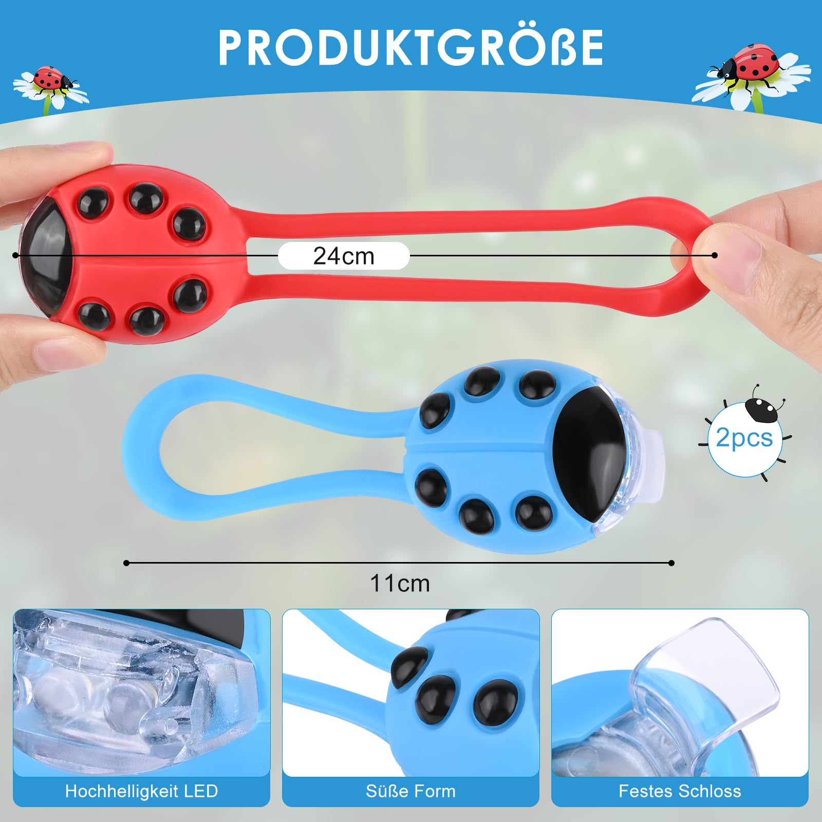 Hey, Sicherheit muss doch nicht langweilig sein! Diese beiden süßen Lichter im Marienkäfer-Design machen dein Kind im Dunkeln sichtbar - und das mit richtig viel Spaßfaktor! Das rote Licht leuchtet rot, das blaue strahlt weiß - und beide haben drei Modi: Dauerlicht, langsames Blinken und schnelles Blinken. Einfach den Knopf drücken und schon wechselt der Modus! Perfekt für Kinderroller, Laufräder, Rollatoren oder Rucksäcke. Der absolute Clou: Das elastische Silikonband! Kein Schrauben, kein Werkzeug - einfach um den Lenker oder Rahmen spannen, fertig! Und wenn du woanders hin willst, nimmst du die Lichter einfach ab und steckst sie woanders dran. Super praktisch! Die Akkulaufzeit ist der Hammer: Bis zu 60 Stunden Dauerlicht, 100 Stunden langsames Blinken oder 80 Stunden schnelles Blinken - mit den bereits installierten CR2032-Batterien. Und das bei Regen? Kein Problem! Mit IPX5 sind die Lichter richtig wasserdicht - egal ob Schnee, Regen oder Spritzwasser. Das Gehäuse aus ABS und Silikon ist auch noch sturzfest. Das Set mit zwei Lichtern (rot/weiß) ist das perfekte Geschenk für kleine Entdecker! Macht jeden Roller, jedes Laufrad oder jeden Rollator sicherer und cooler. Dein Kind wird die Lichter lieben - und du hast ein besseres Gefühl, wenn es in der Dämmerung unterwegs ist. Einfach anbringen, einschalten und los geht's - sicher und mit Style!