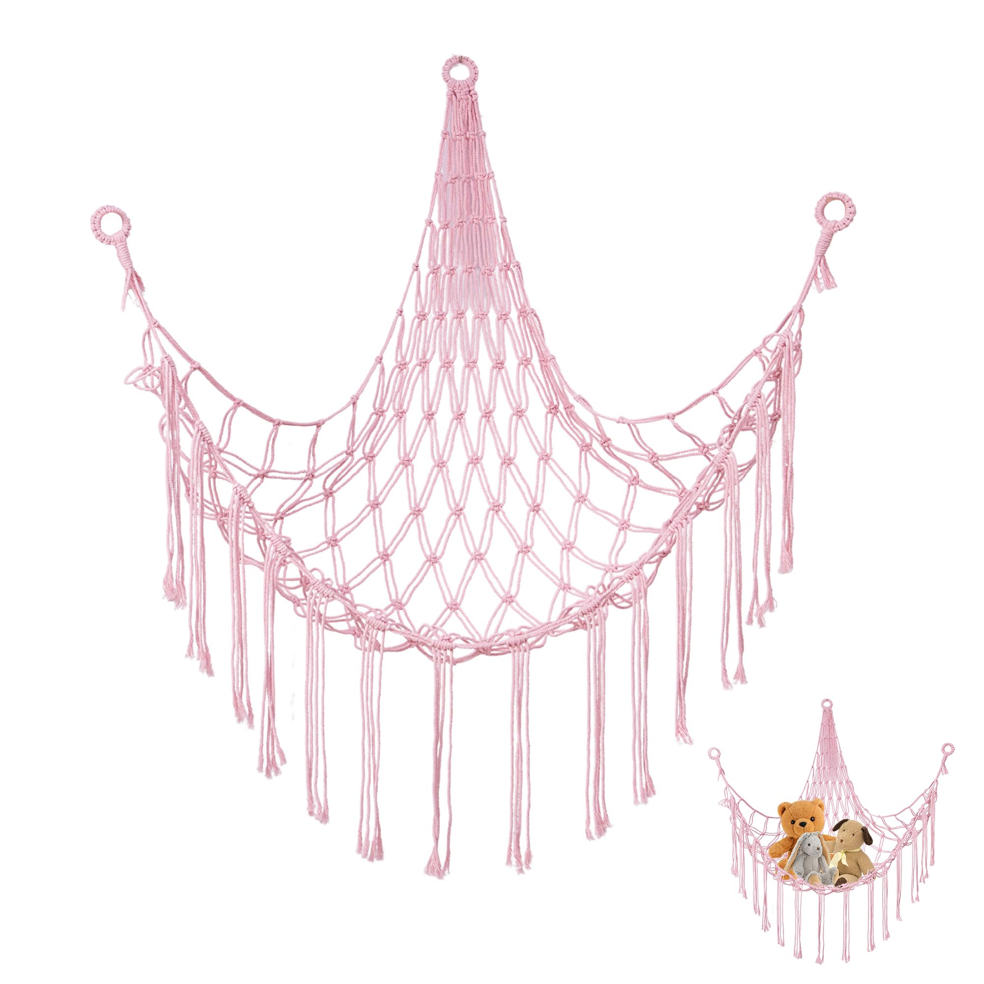 Schluss mit Chaos im Kinderzimmer! Dieses süße Lunriwis Kuscheltier Netz in Rosa (auch in Schwarz oder Lila erhältlich) bringt Ordnung und sieht dabei noch total niedlich aus. Aus strapazierfähigem Baumwollseil handgewebt, bietet es Platz für bis zu 45 Stofftiere (Größe 14-20 cm). Das Besondere: Integrierte LED-Lichterketten sorgen für gemütliches Licht - Batterien leider nicht im Lieferumfang. Mit 3 Aufhängepunkten und Haken lässt sich das Netz ganz einfach an der Decke oder Wand befestigen. Die Makramee-Quasten verleihen dem Ganzen einen echten Boho-Charme. Aber nicht nur für Kuscheltiere geeignet - auch Kleidung, Decken oder Kissen finden hier Platz. So lernen Kinder spielerisch Aufräumen und haben ihre Lieblinge immer im Blick. Ein echter Hingucker, der jedes Kinderzimmer gemütlicher macht!