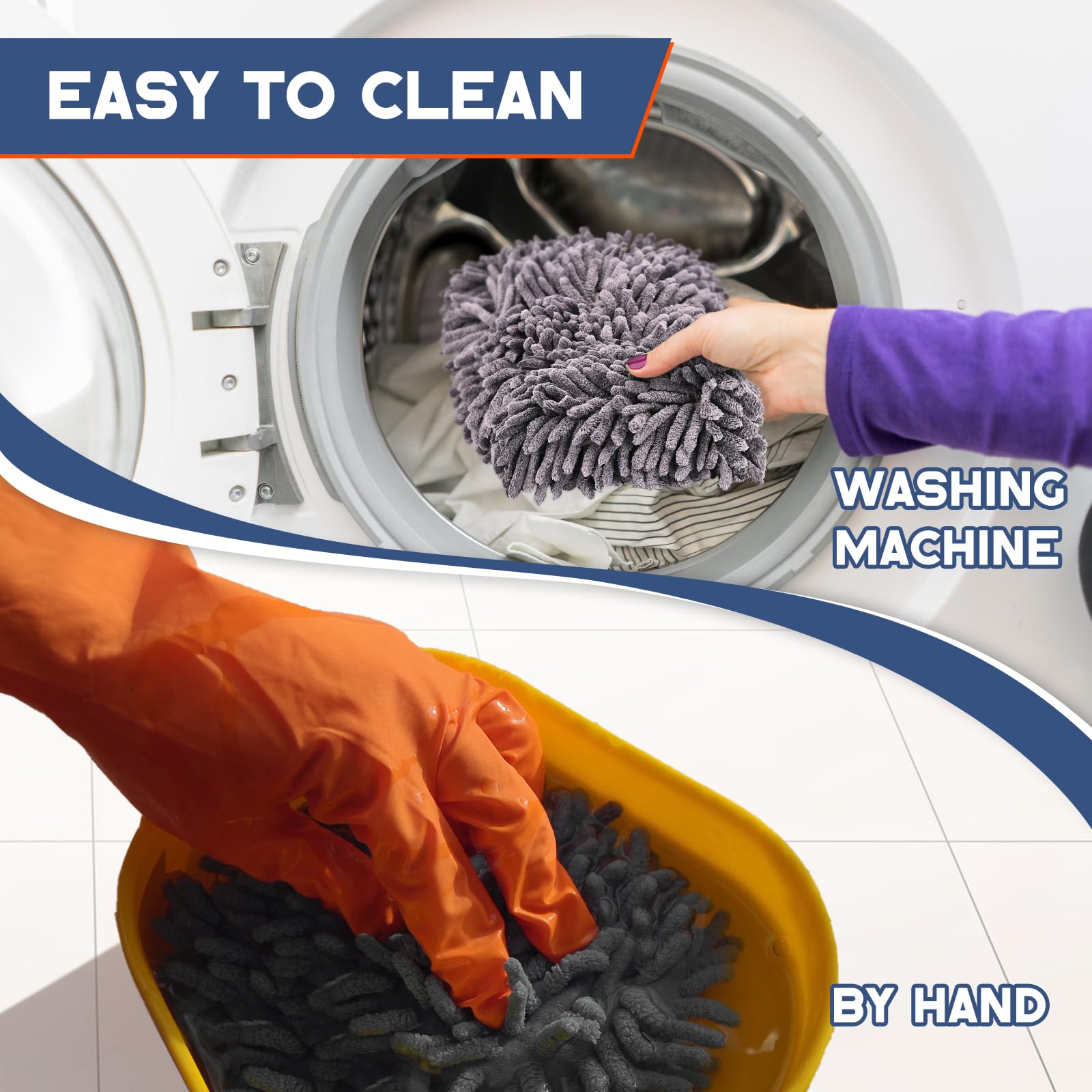 Wow, mit diesen Waschhandschuhen macht Autoputzen richtig Spaß! Im 2er-Set bekommst du zwei super praktische Handschuhe, die wirklich alles können.\n\nDas Material ist der absolute Hammer: Hochwertige Mikrofaser, die bis zu zehnmal ihr Eigengewicht an Wasser aufsaugen kann. Das bedeutet - keine lästigen Pfützen mehr und dein Auto ist ratzfatz trocken!\n\nAber das ist noch nicht alles: Die Handschuhe haben drei verschiedene Oberflächen für unterschiedliche Reinigungsaufgaben. Die weiche Chenille-Seite nimmt Staub und normalen Schmutz weg, ohne Kratzer zu hinterlassen. Die Korallenvlies-Seite ist perfekt für empfindliche Lacke - absolut kratzfrei! Und die gitterartige Oberfläche packt sich hartnäckige Dinge wie Vogelkot oder Klebereste an.\n\nDas elastische Bündchen am Handgelenk ist genial - der Handschuh rutscht nicht ab, egal wie nass er ist. Und weil er so flexibel ist, kommst du auch super in alle Ecken und Ritzen.\n\nNicht nur fürs Auto geeignet: Du kannst die Handschuhe auch in Haushalt und Garten verwenden - für Möbel, Küche, Bad... überall wo's sauber werden soll!\n\nReinigung? Total easy! Einfach auswaschen und trocknen lassen. Die Qualität ist so gut, dass die Handschuhe ewig halten. Einfach anziehen, nass machen und losputzen - dein Auto wird strahlen!
