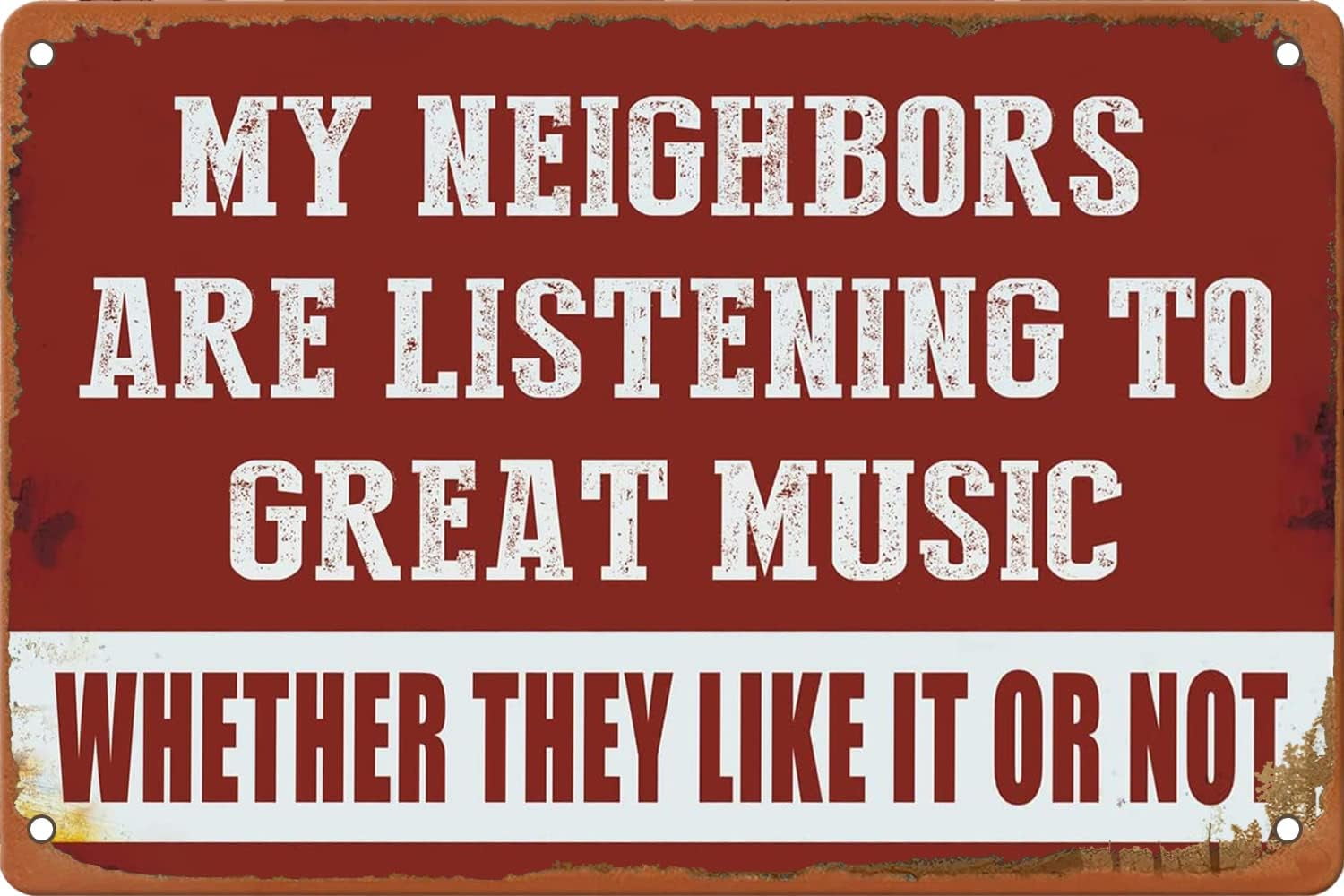Cooles Statement für deine vier Wände! Dieses lustige Metallschild mit der Aufschrift 'My Neighbors Are Listening to Great Music' ist der perfekte Hingucker für Musikzimmer, Garage, Bar oder Männerhöhle. Aus hochwertigem Aluminium (20,3x30,5cm), wetterfest und langlebig. Mit 4 vorgebohrten Löchern für einfache Montage an Wand, Tür oder Zaun. Das vintage Design mit künstlichen Rost-Effekten verleiht jedem Raum industriellen Charme. Ein ideales Geschenk für Musikliebhaber und alle, die humorvolle Dekoration mögen. Leicht zu reinigen und jahrelang haltbar - ein echter Eyecatcher!