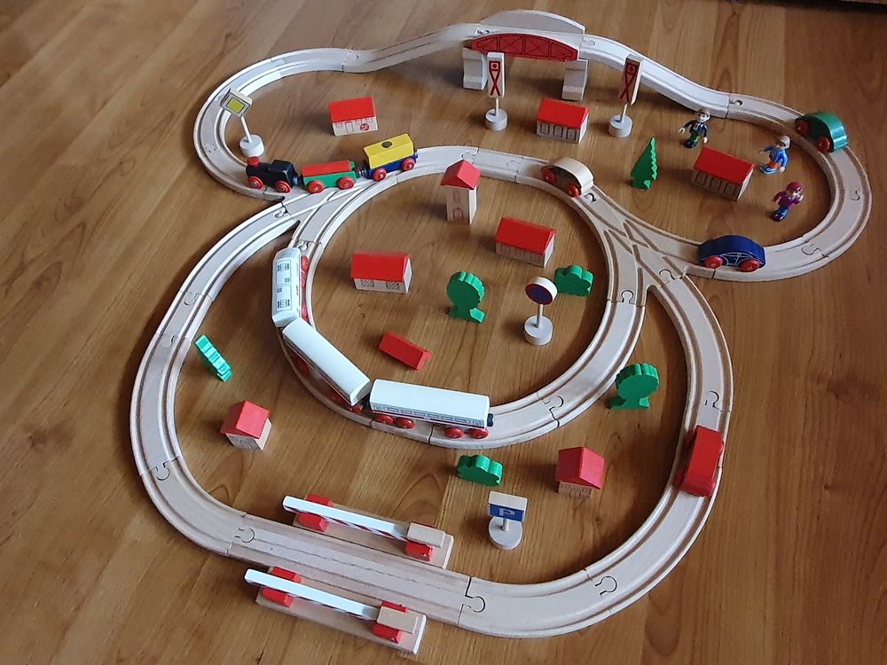 Alles einsteigen - die große Eisenbahnfahrt kann beginnen! Dieses umfangreiche 35-teilige Set begeistert kleine Lokführer ab 3 Jahren. Die batteriebetriebene Lok (2x AAA benötigt) fährt wie von Zauberhand über die Holzschienen. Die magnetischen Wagen koppeln sich ganz einfach an - kein Frust für kleine Kinderhände. Mit dabei: Häuser, Bäume, Figuren und Verkehrsschilder zum Aufbau einer ganzen Spielwelt. Die hochwertigen Holzschienen lassen sich immer wieder neu kombinieren - der Kreativität sind keine Grenzen gesetzt! Die abgerundeten Kanten und ungiftigen Materialien machen das Spielen sicher. Nebenbei fördert die Eisenbahn die Vorstellungskraft, Motorik und das räumliche Denken. Perfekt für allein oder mit Freunden - stundenlangen Spielspaß garantiert! Nach dem Spielen einfach in der praktischen Box verstauen. Das ideale Geschenk für kleine Eisenbahnfans zu Weihnachten oder Geburtstag. Hier entstehen unvergessliche Spielmoment - choo-choo!
