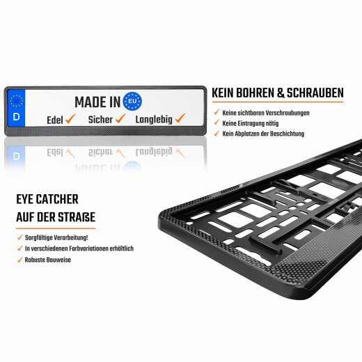 Hey Autofreund! Schluss mit klappernden Nummernschildern! Dieser Kennzeichenhalter im coolen Carbon-Look bringt Ordnung an dein Auto. Mit den Maßen 520x110mm passt er perfekt für alle EU-Kennzeichen (Achtung: Nicht für Österreich und Schweiz!). Der integrierte Vibrationsdämpfer sorgt dafür, dass dein Kennzeichen auch bei holprigen Straßen ruhig bleibt und nicht klappert. Die gummierten Einlagen verhindern lästiges Verrutschen und schützen vor Beschädigungen. Mit dem praktischen Clicksystem und den 8 mitgelieferten Schrauben ist die Montage ein Kinderspiel - kein Profi-Werkzeug nötig! Der 3D-Effekt durch hochwertige Polymeraufkleber sieht nicht nur mega aus, sondern ist auch beständig gegen Temperatur, Chemikalien und Kratzer. Hergestellt von UAB AUTOSmilga, einem Familienunternehmen mit jahrelanger Erfahrung. Universelles Lochbild passt für die meisten Fahrzeugtypen. Also worauf wartest du? Mach dein Auto komplett und verabschiede dich für immer von nervigen Klappergeräuschen!